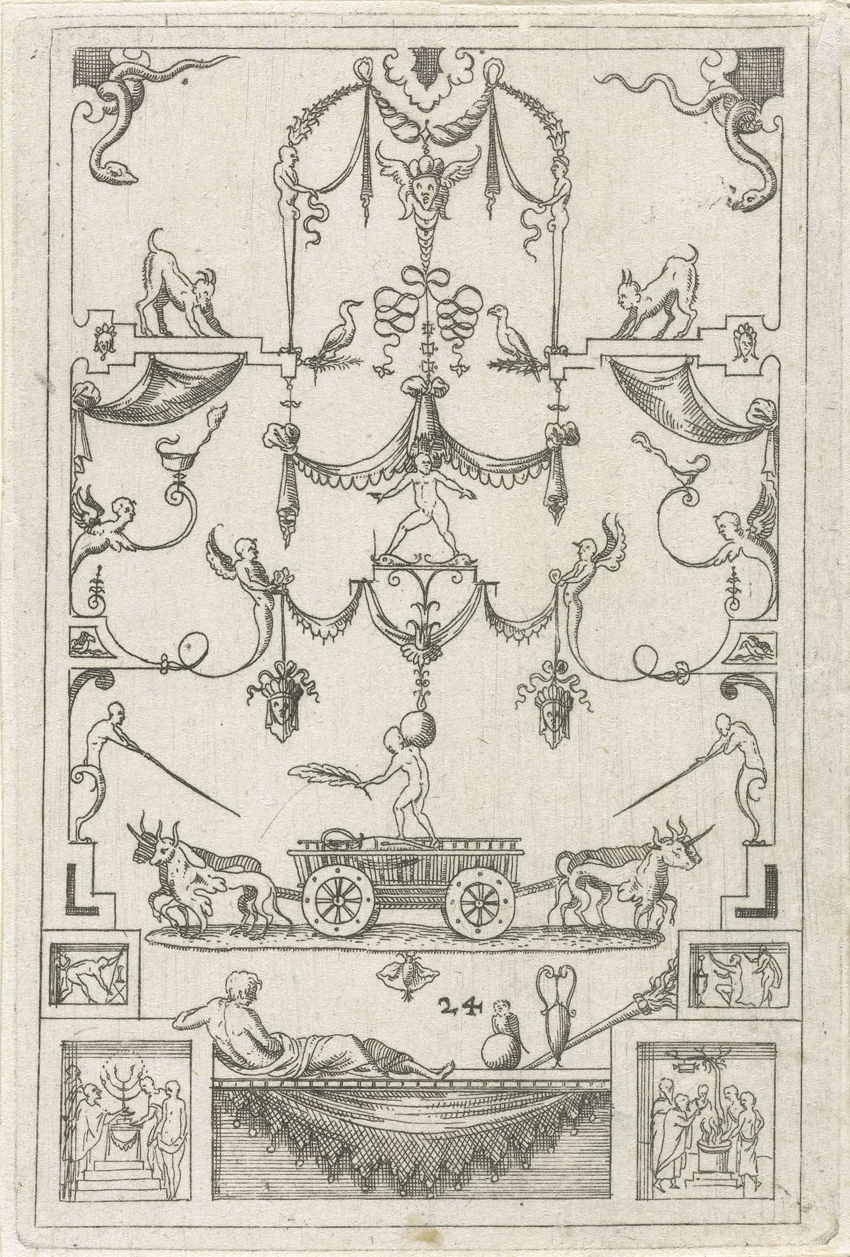 Kopie naar prent van Jacques Androuet Ducerceau, ontleend aan een vlakdecoratie van Enea Vico. Blad uit serie met architectuurfantasieën en grotesken met fabelwezens, guirlandes, kandelabers en mascarons.