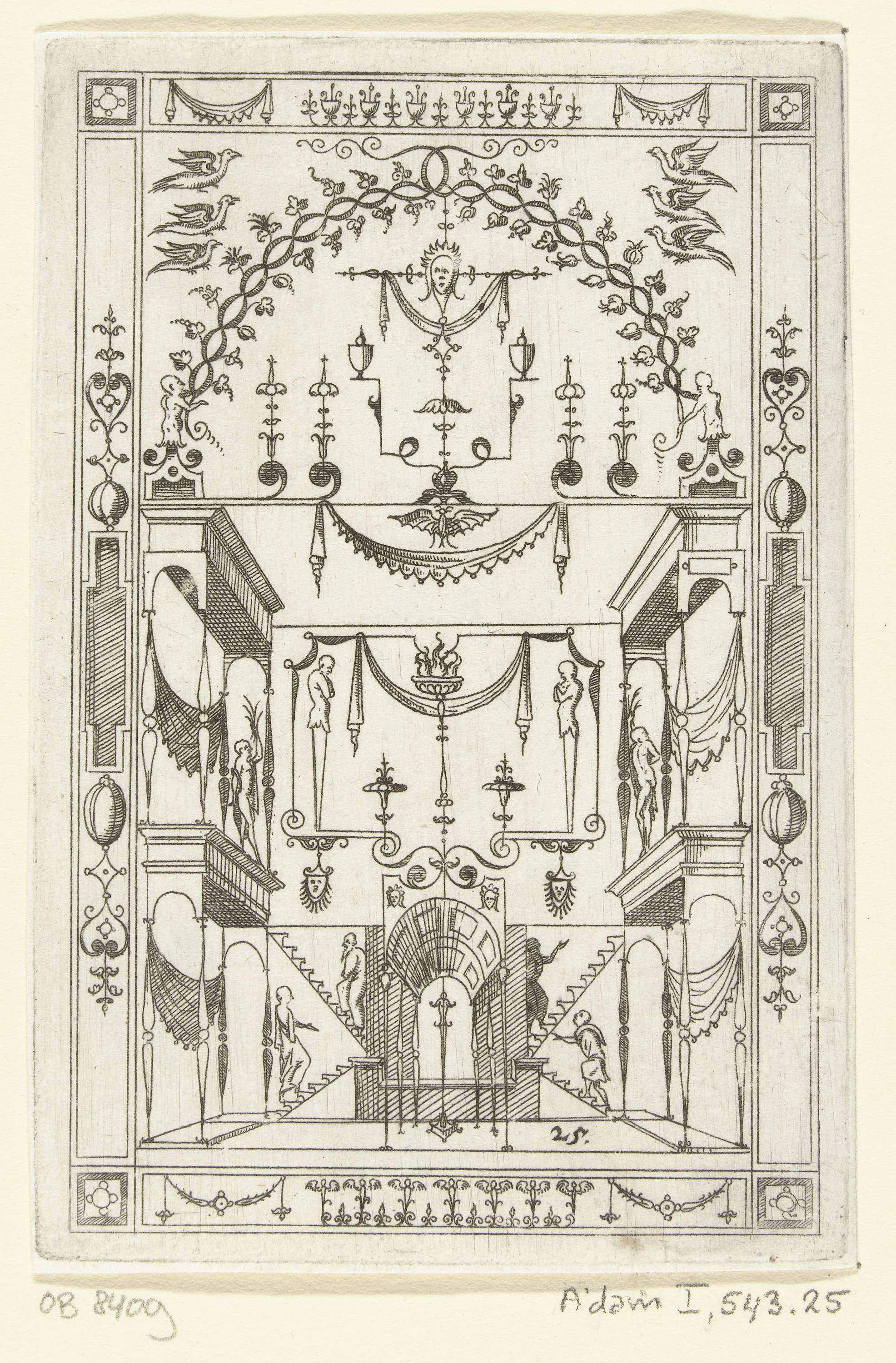 Kopie naar prent van Jacques Androuet Ducerceau, ontleend aan een vlakdecoratie van Enea Vico. Blad uit serie met architectuurfantasieën en grotesken met fabelwezens, guirlandes, kandelabers en mascarons.