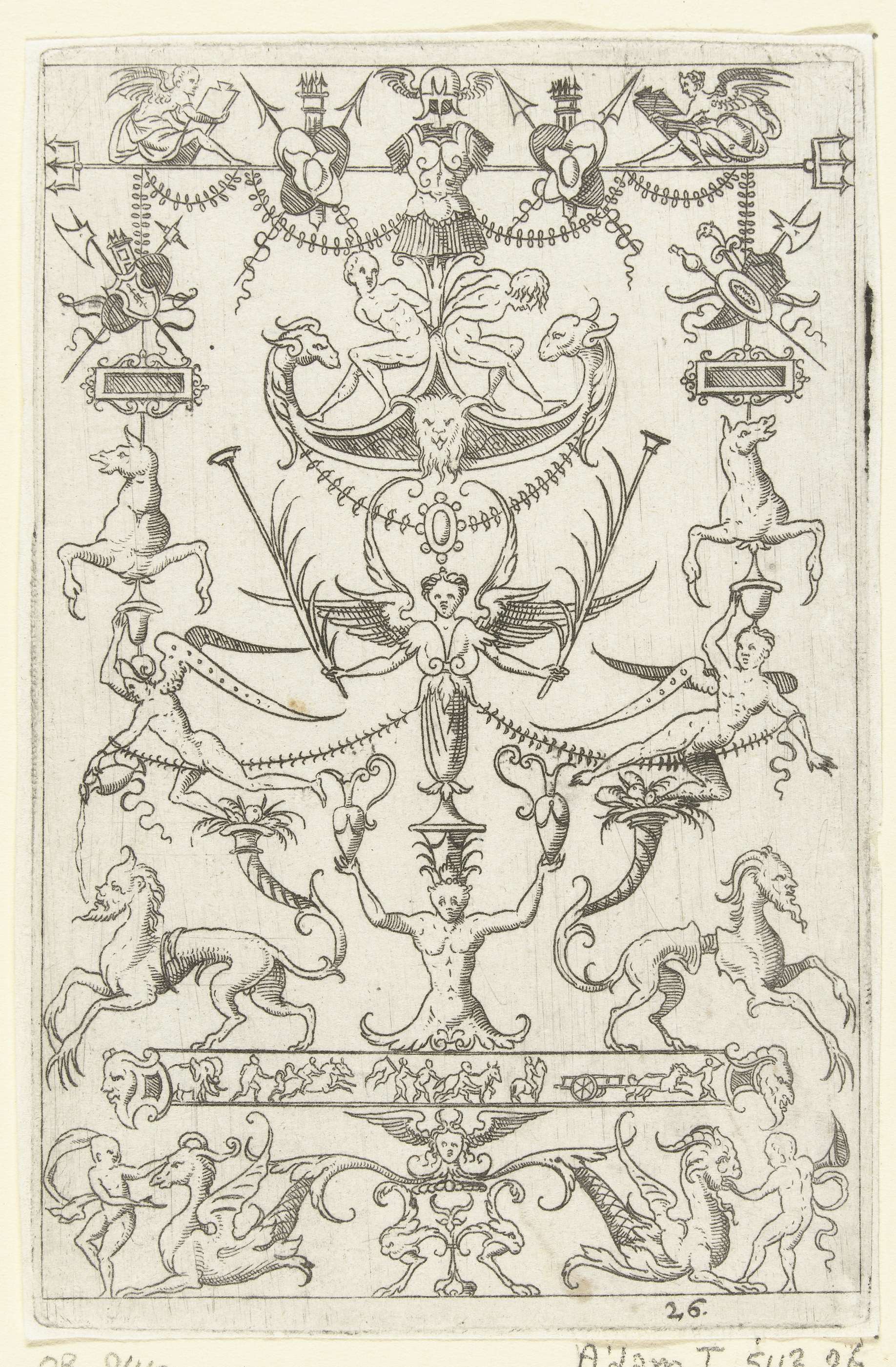 Tegenzijdige kopie naar prent van Jacques Androuet Ducerceau, ontleend aan een vlakdecoratie van Nicoletto da Modena. Blad uit serie met architectuurfantasieën en grotesken met fabelwezens, guirlandes, kandelabers en mascarons.