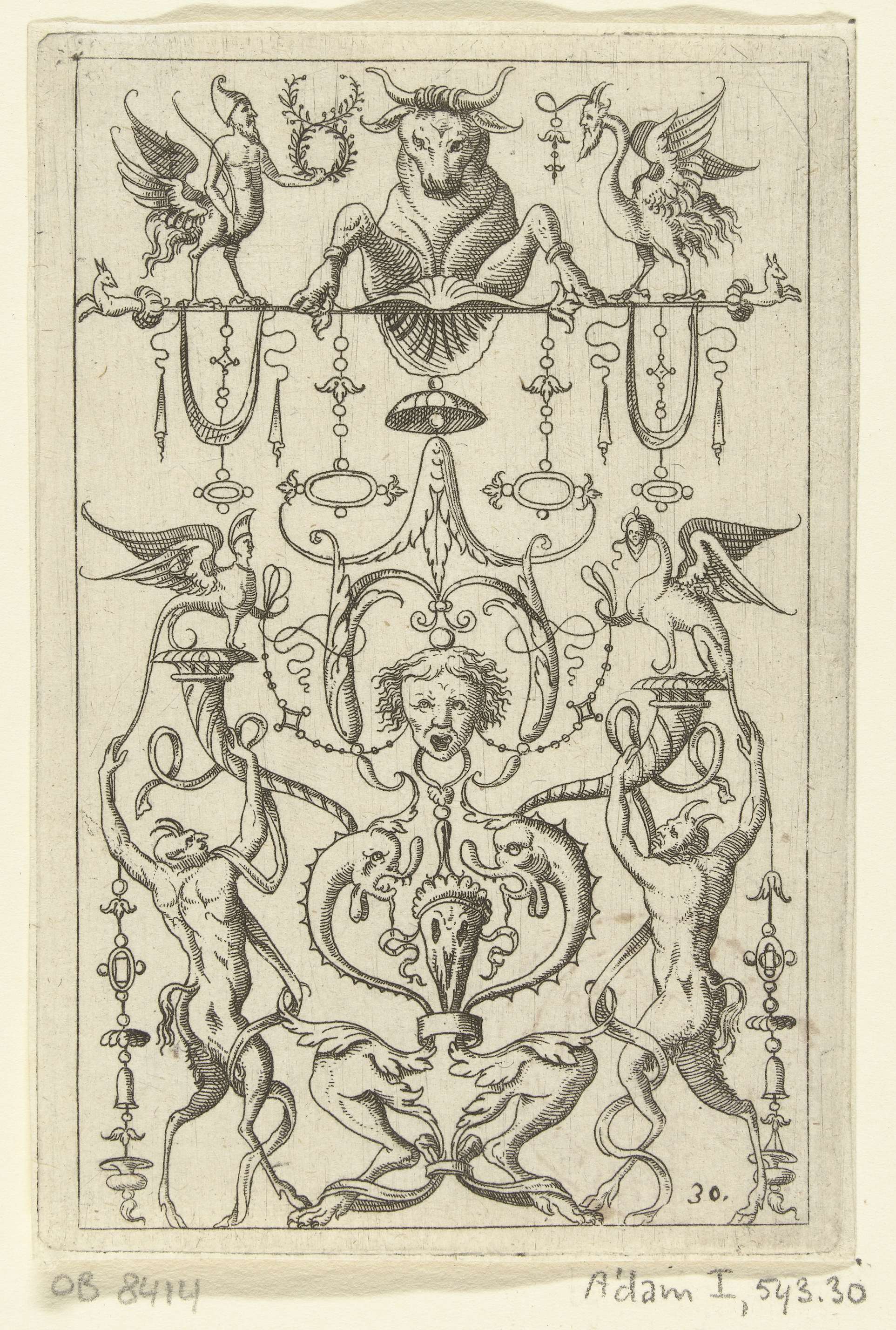Gelijkzijdige kopie naar prent van Jacques Androuet Ducerceau, ontleend aan een vlakdecoratie van Agostino Veneziano. Blad uit serie met architectuurfantasieën en grotesken met fabelwezens, guirlandes, kandelabers en mascarons.