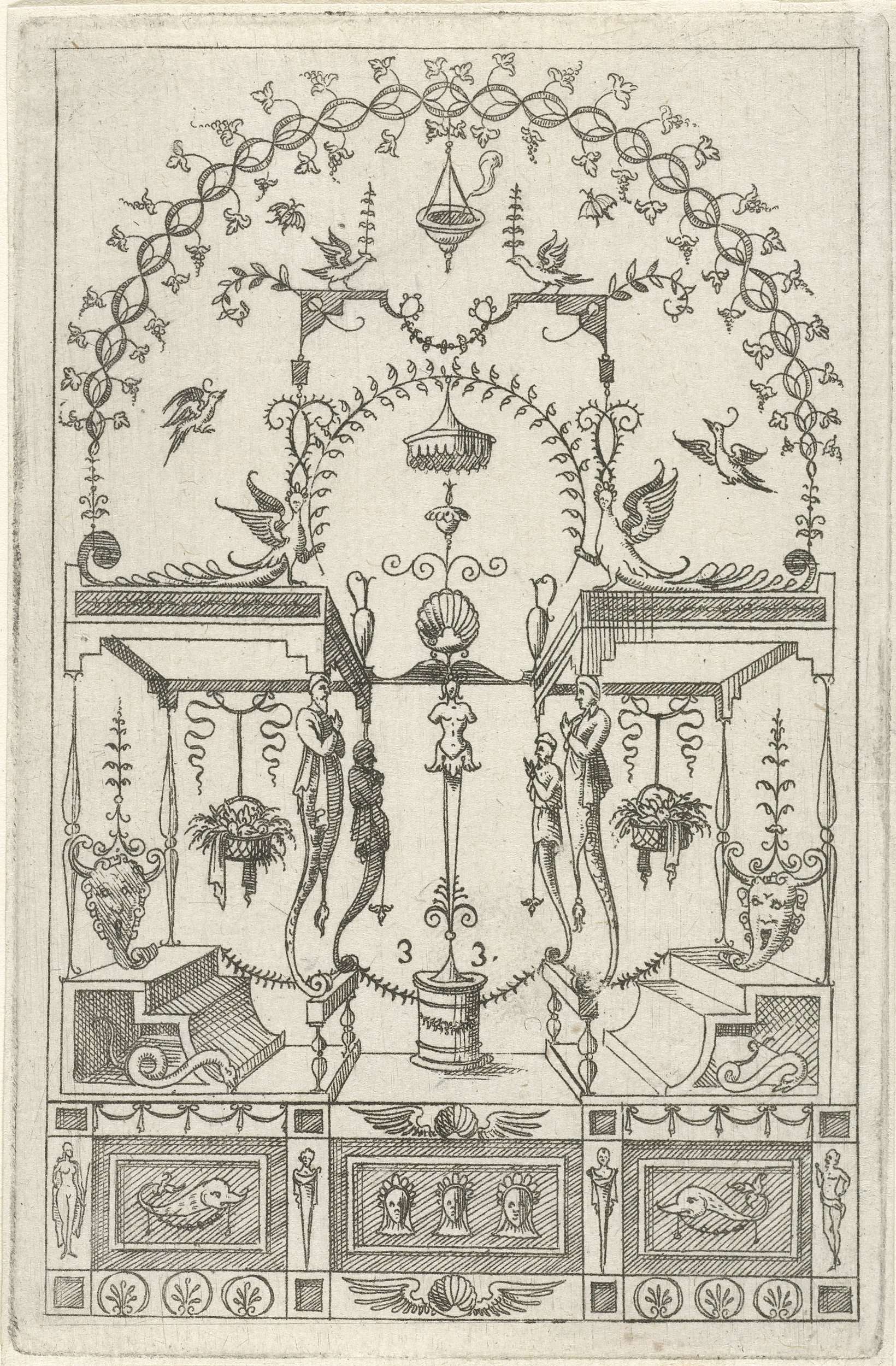 Kopie naar prent van Jacques Androuet Ducerceau, ontleend aan een vlakdecoratie van Enea Vico. Blad uit serie met architectuurfantasieën en grotesken met fabelwezens, guirlandes, kandelabers en mascarons.