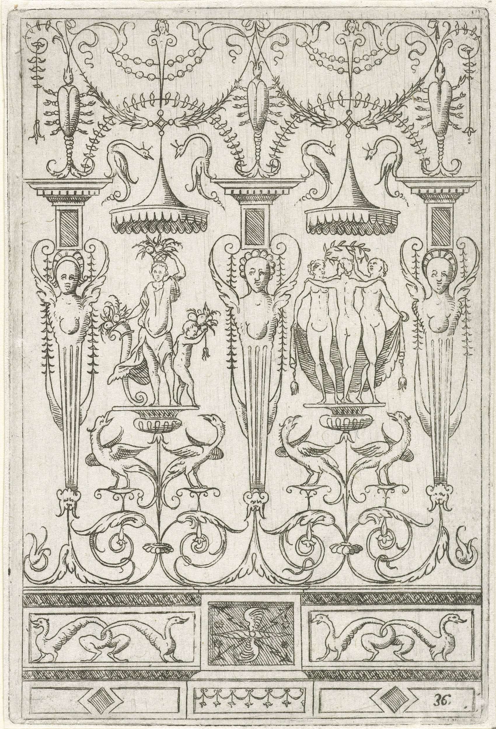 Blad uit serie met architectuurfantasieën en grotesken met fabelwezens, guirlandes, kandelabers en mascarons.