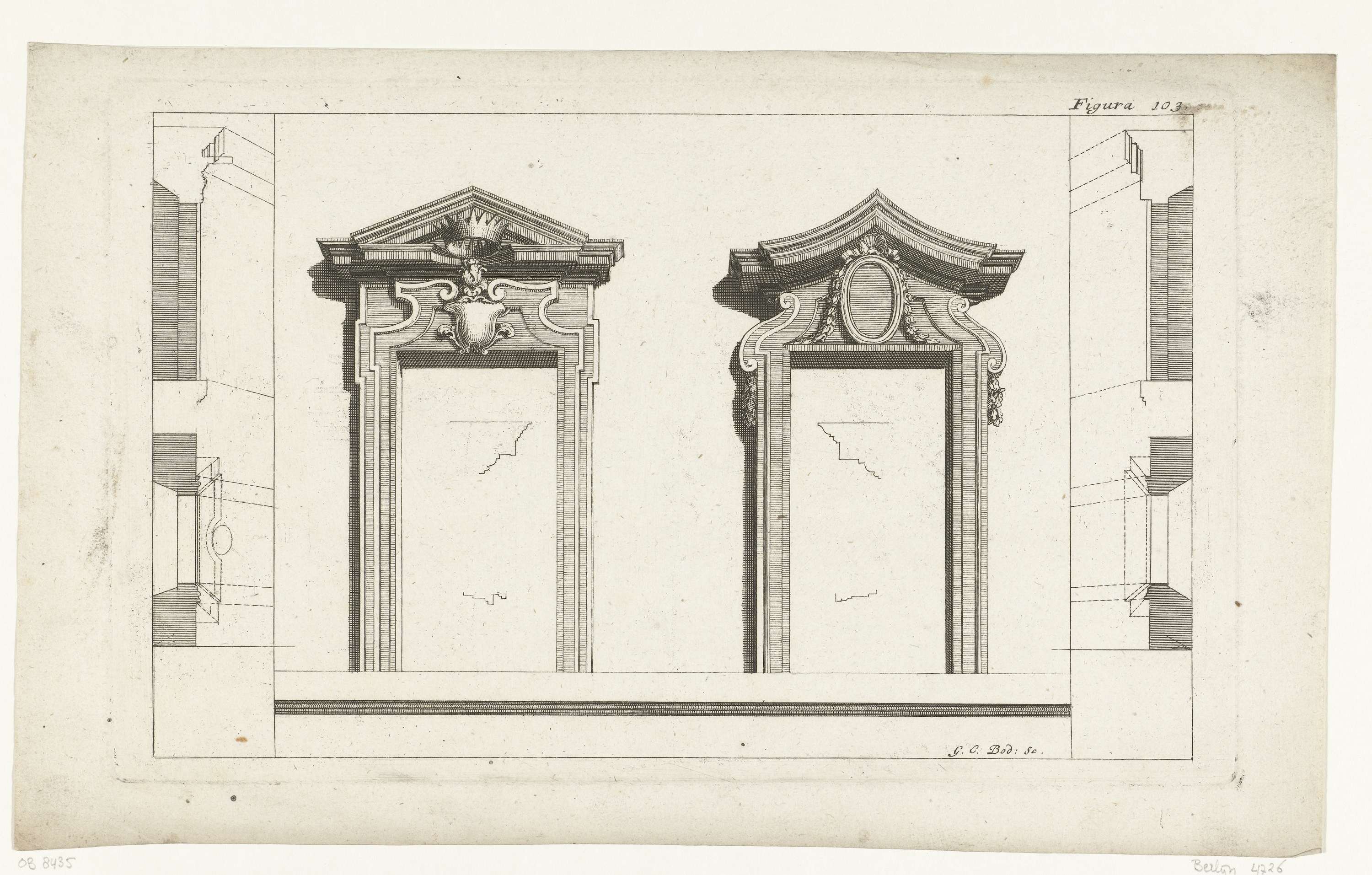 Raamkozijnen met opstand, plan, profiel en details. Rechtsboven staat: Figura 103.