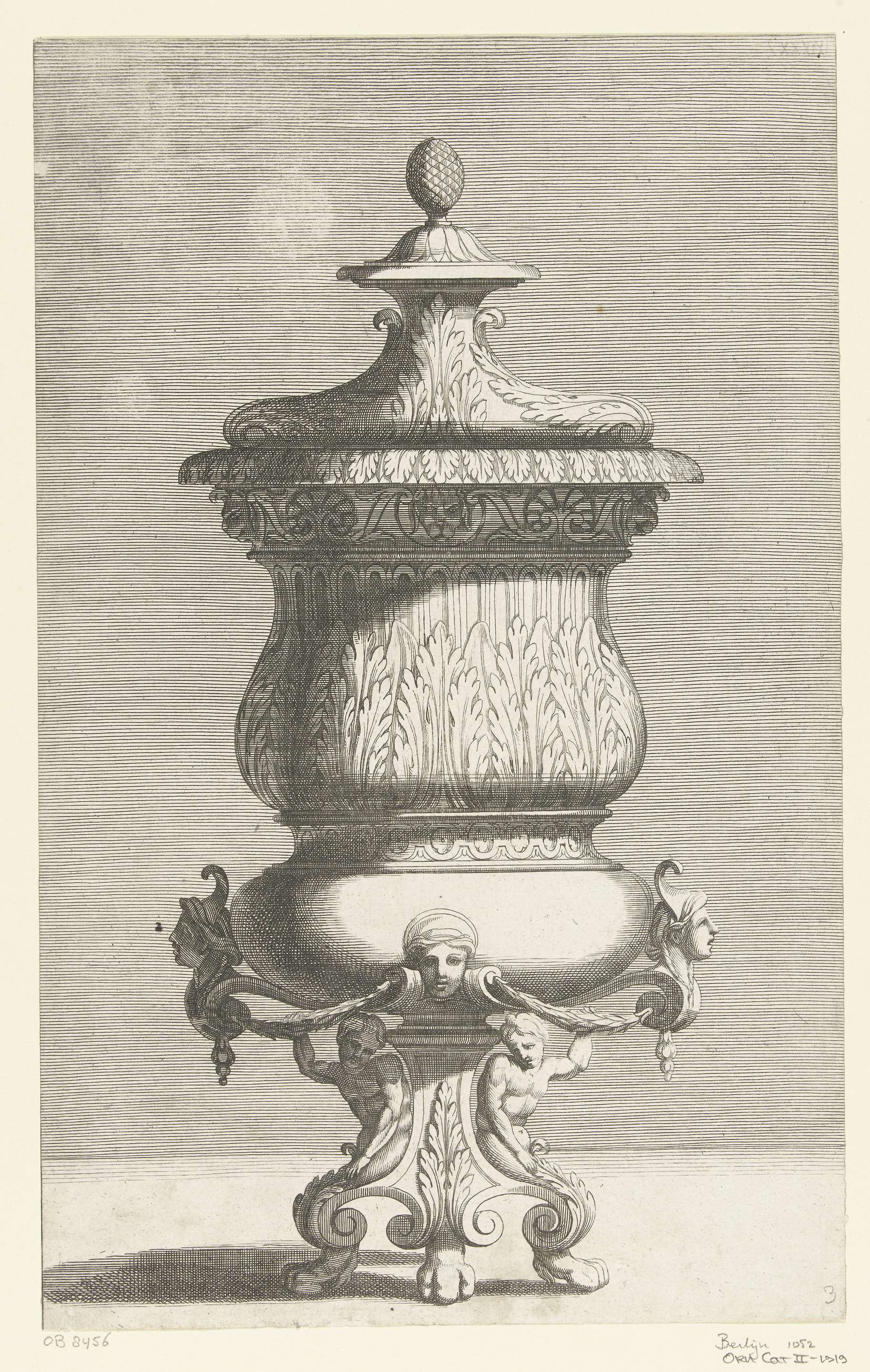 Het lichaam van de vaas is gedecoreerd met acanthusbladeren, de balustervormige voet rust op consoles ondersteund door klauwen, waarop twee hermen zitten. Blad 3 uit serie van 6 bladen met vazen en urnen.