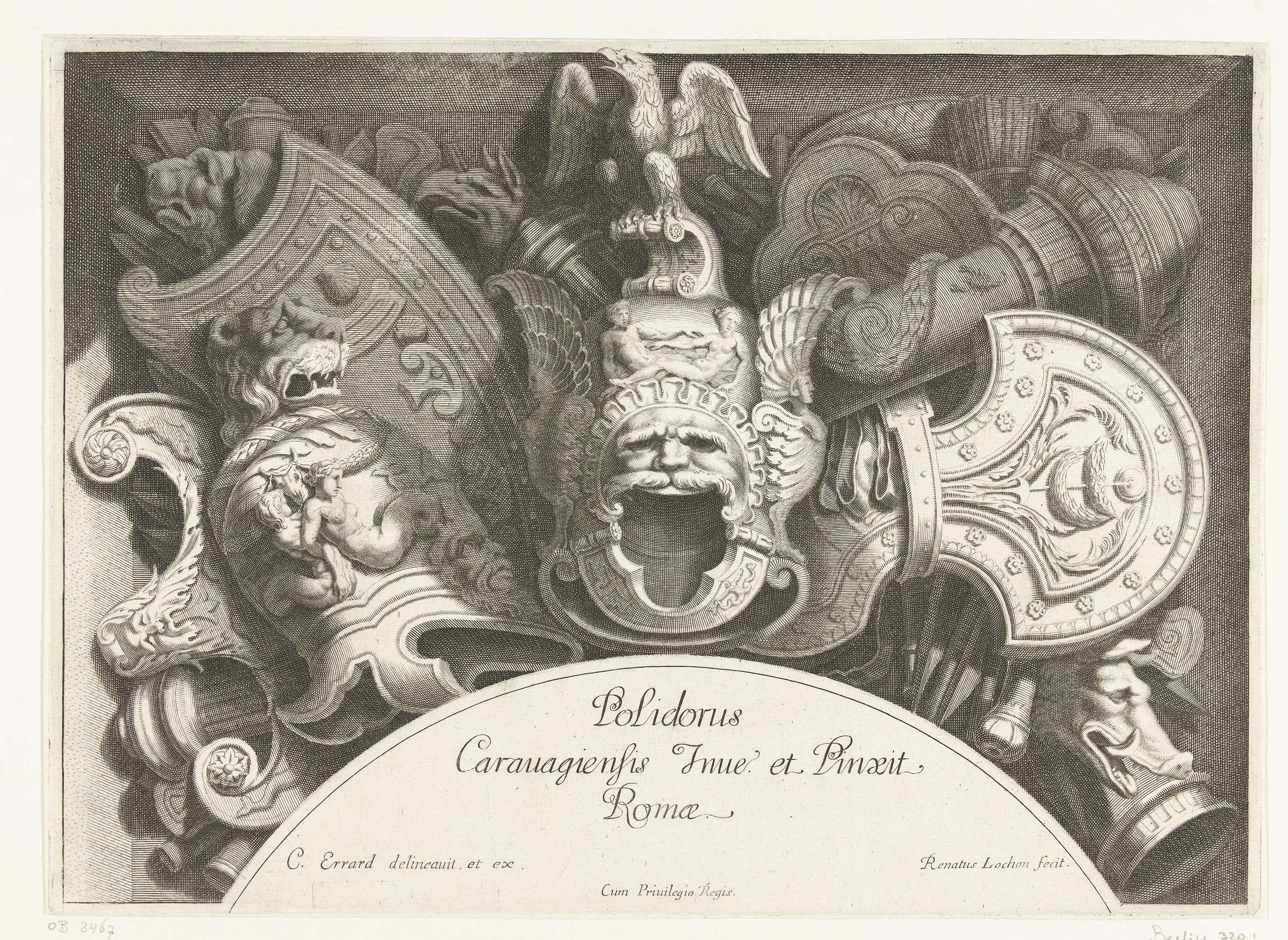 Helm in de vorm van een masker, de zijkanten zijn gedecoreerd met gevleugelde, naakte vrouwen. Uit serie van titelblad en vijf bladen.