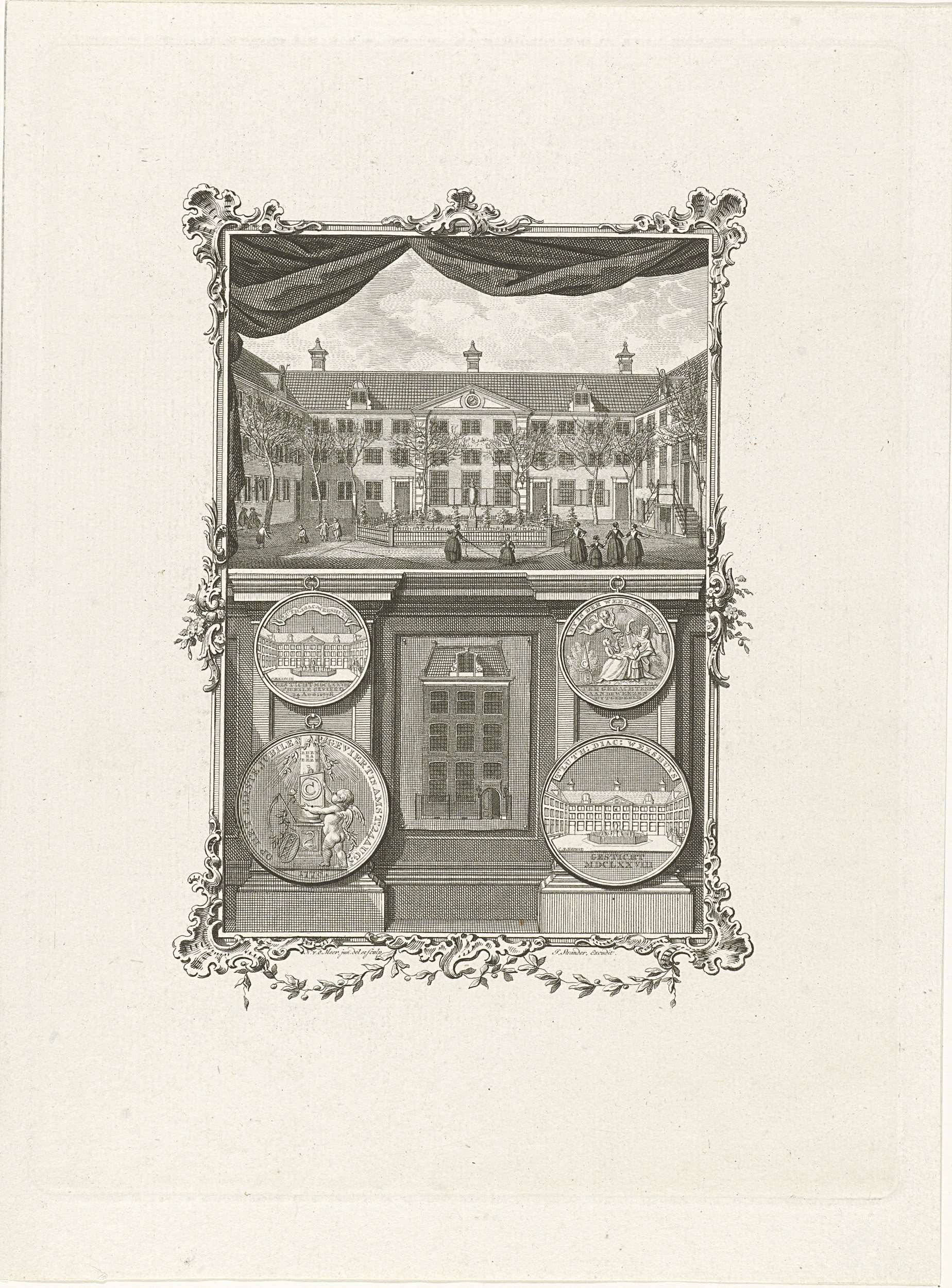 Gezicht op de Lutherse Diaconessen Weeshuis te Amsterdam, naar aanleiding van het eeuwfeest gevierd op 24 augustus 1778. Onderaan twee penningen vervaardigd naar aanleiding van het eeuwfeest.