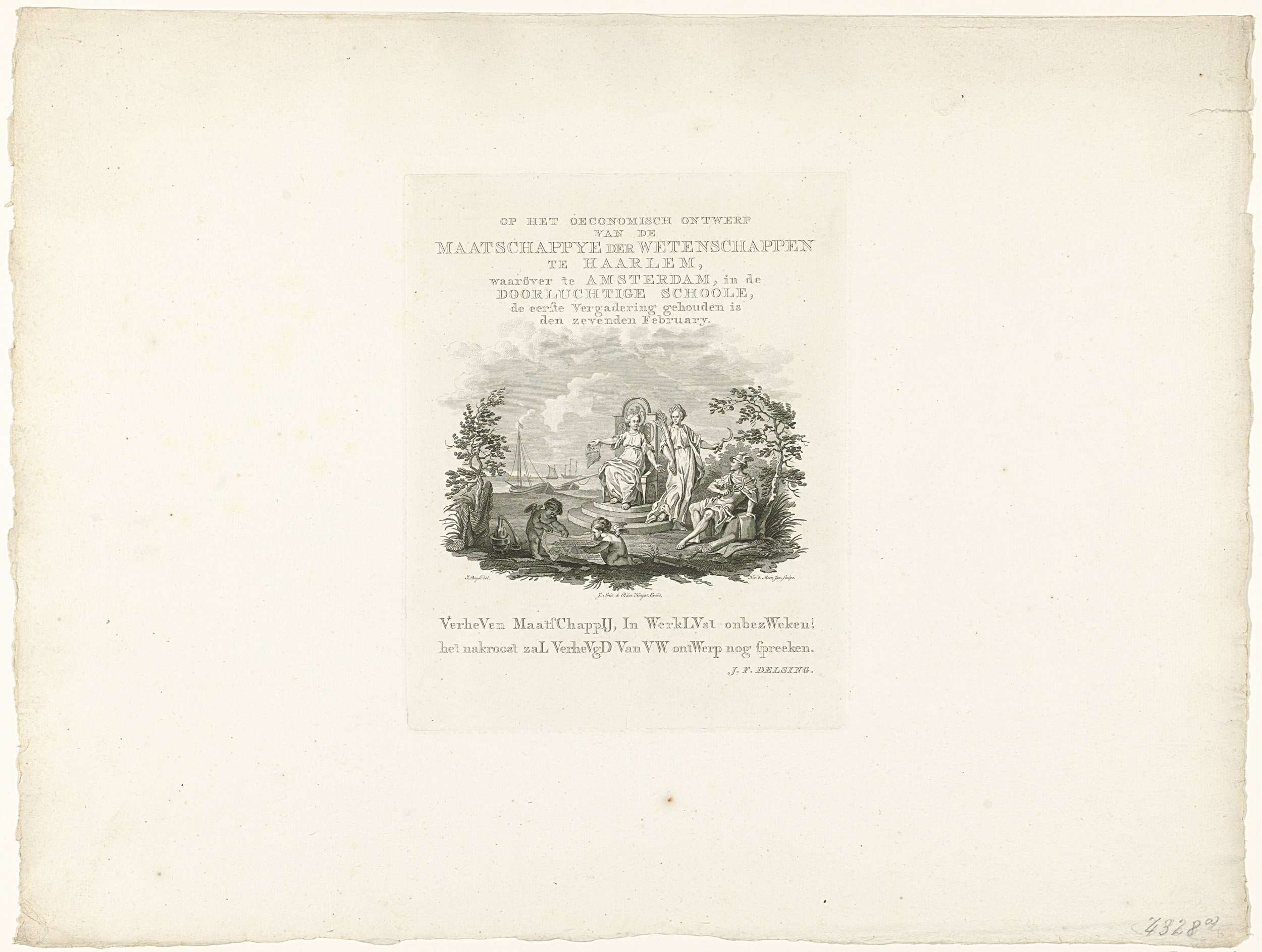 Tijdvers op de eerste vergadering van de nieuwe Oeconomische tak van de Maatschappij der Wetenschappen te Haarlem, gehouden op 7 februari 1778 in Amsterdam. Allegorische voorstelling van een landschap met de personificatie van de Maatschappij met Ceres en Mercurius, op de voorgrond twee putti met het ontwerp van een gebouw. Onder de voorstelling het tijdvers ...