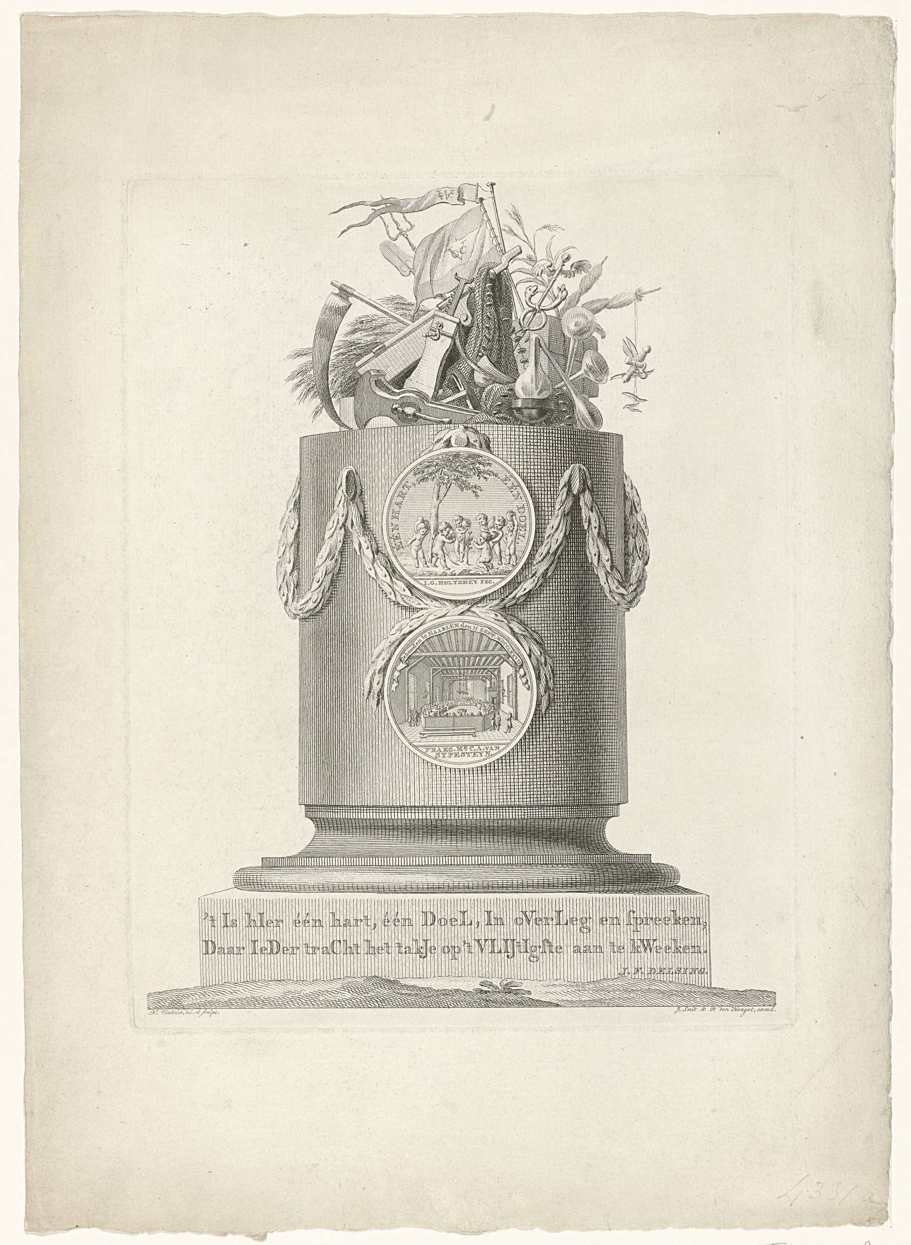 Zuil met voetstuk waarop een tijdvers op de algemene vergadering van de nieuwe Oeconomische tak van de Maatschappij der Wetenschappen te Haarlem, gehouden op 15 september 1778 in de zaal van het Diaconiehuis te Haarlem. Op de voorzijde van de zuil de penning geslagen ter gelegenheid van deze bijeenkomst, bovenop attributen van de beoefende wetenschappen.