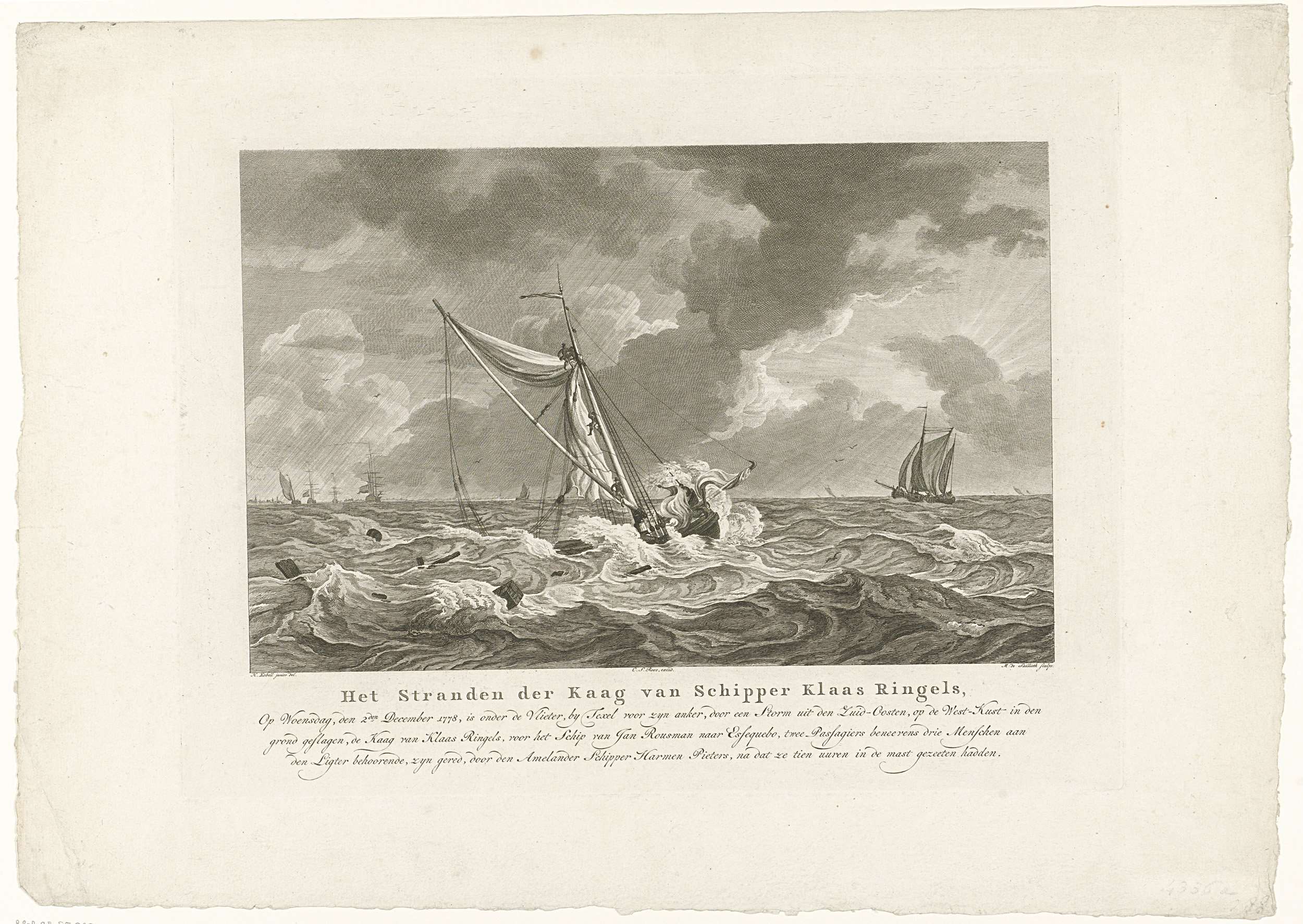 Het stranden van de kaag van schipper Klaas Ringels tijdens een storm bij Texel, op 2 december 1778. De vijf personen aan boord werden gered door de Amelander schipper Harmen Pieters, nadat ze tien uur in de mast hadden gezeten. In het onderschrift de titel en drie regels tekst.