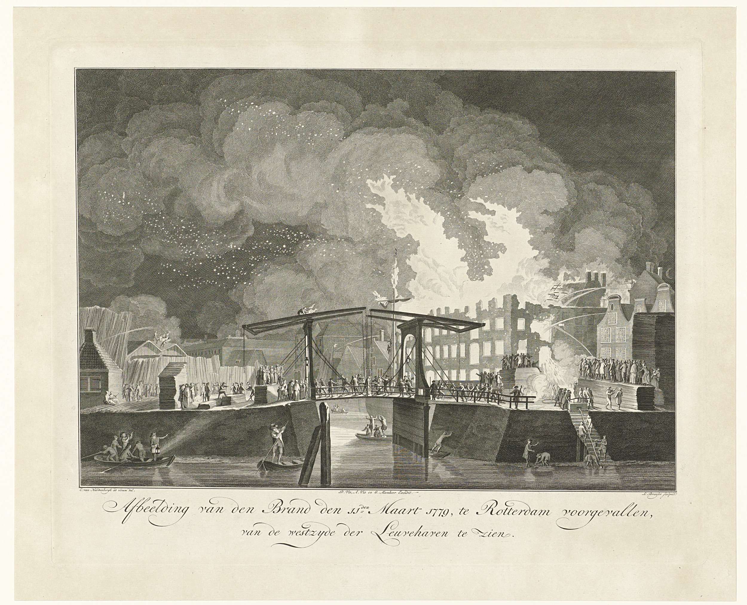 Grote brand in enkele huizen in de Pottebakkerssteeg te Rotterdam, 11 maart 1779. Grote menigte op straat, met brandspuiten wordt geprobeerd de brand te blussen. Gezien vanuit de Leuvehaven met centraal de Scheluwebrug.