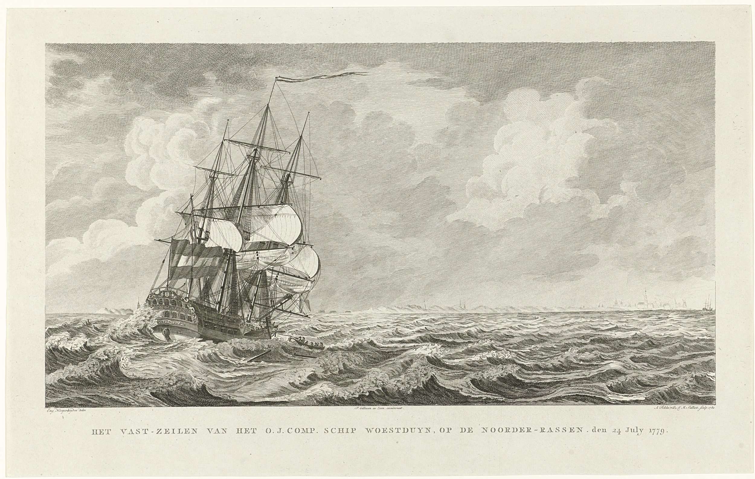 De Woestduin loopt vast op de Noorderrassen, 24 juli 1779. Eerste plaat in een serie van vier over de redding door de gebroeders Frans en Jacob Naerebout van de 87 opvarenden van het VOC-schip Woestduin (Woestduyn) dat op 24 juli 1779 strandde bij de Noorderrassen (voor de kust van Westkapelle).