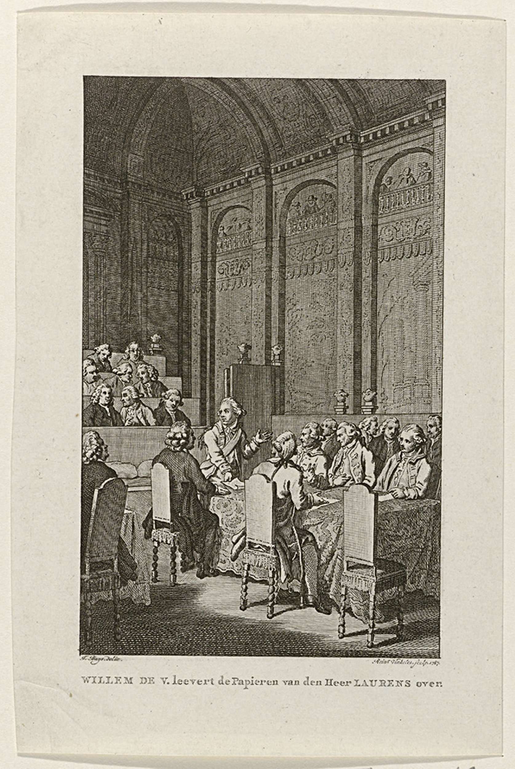 Stadhouder Willem V levert bij de vergadering van de Staten van Holland de door de Engelsen in beslag genomen papieren van de Amerikaan Henry Laurens in, 20 oktober 1780.