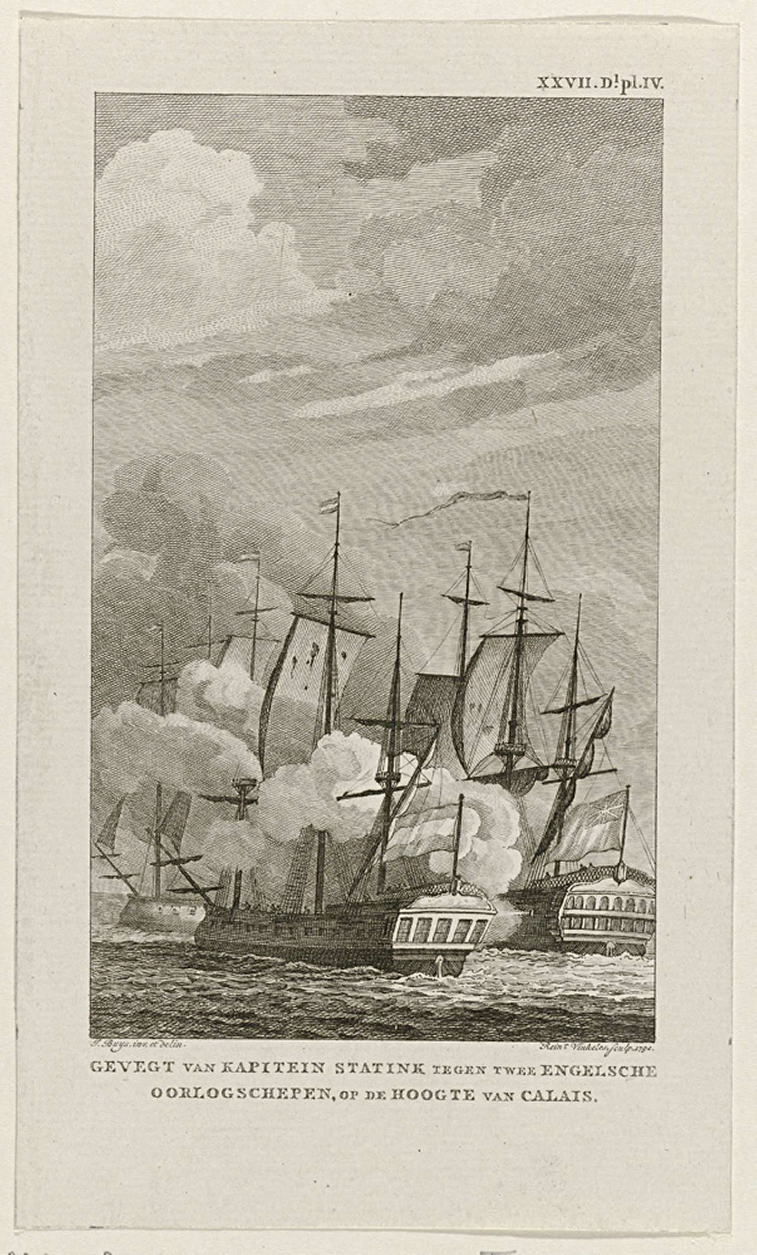 Het schip de Prinses Carolina onder bevel van kapitein Statink wordt in het Kanaal bij Calais aangevallen en opgebracht door twee Engelse oorlogsschepen, 25 december 1780. Gemerkt rechtsboven: XXVII.Dl.pl.IV.