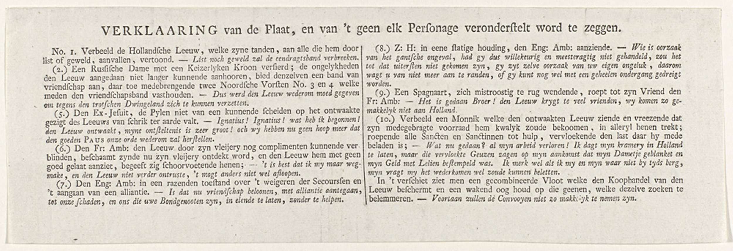 Tekstblad met een verklaring van de voorstelling van de spotprent: De Nederlandse Leeuw voorheen door list en geweld aangevallen is nu ontwaakt. Spotprent op de politieke gebeurtenissen in het jaar 1780. Tekst in twee kolommen met verklaring van de cijfers 1-10.