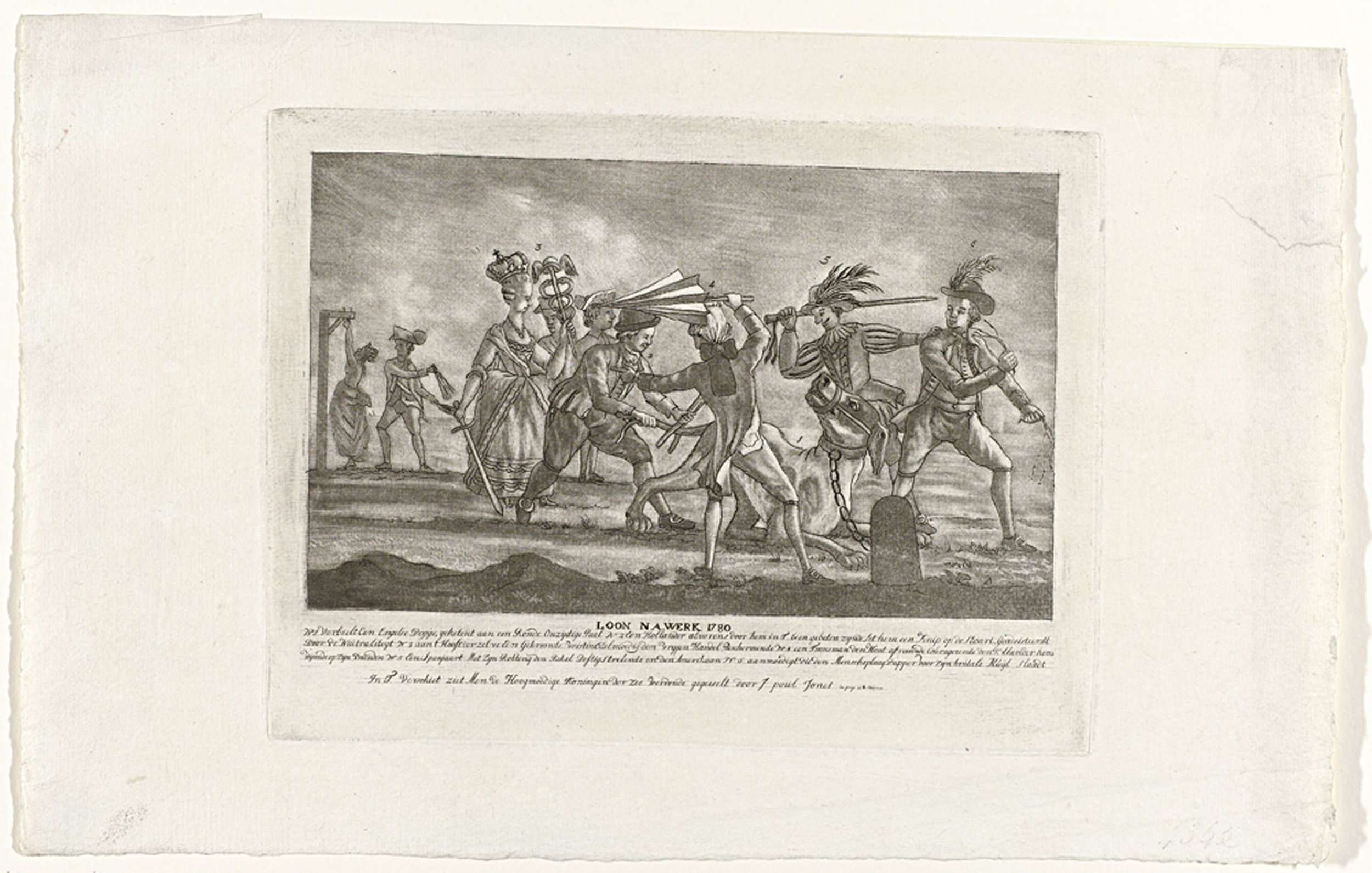 Spotprent op de benarde positie van de Engelsen in in 1780. De Engelse dog gebonden aan een paal wordt geslagen door een Hollander, Fransman, Spanjaard en Amerikaan. Keizerin Catharina de Grote kijkt toe. Op de achtergrond wordt de Britse koningin van de Zee gegeseld door de Amerikaanse kaper John Paul Jones. In het onderschrift de ...