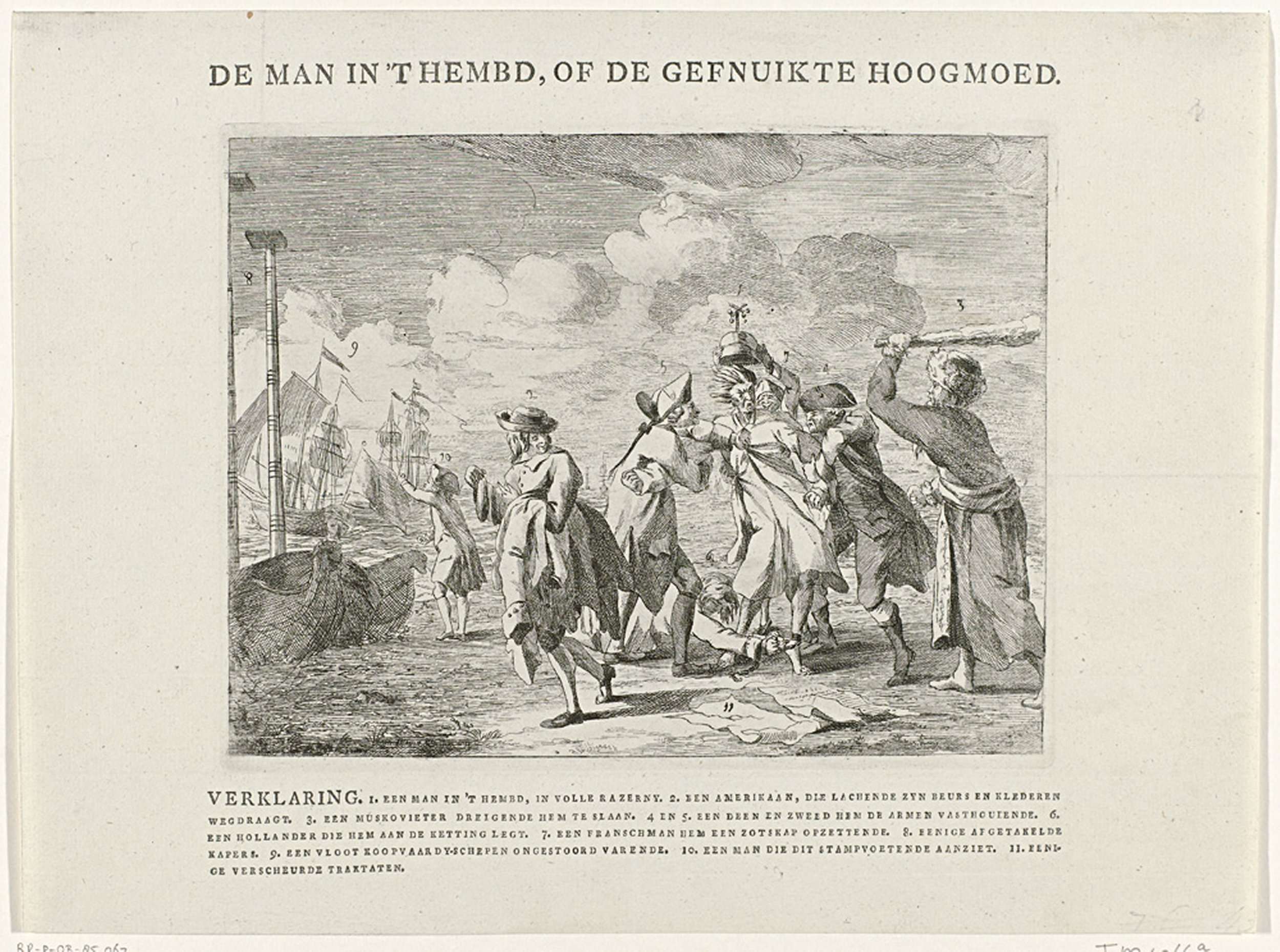 Spotprent op de benarde positie van de Engelsen in 1780. Een Engelsman wordt door de andere Europese landen tot op het hemd uitgekleed, geketend, bedreigd en bekroond met een zotskap. Op het blad onder de plaat de verklaring van de cijfers 1-10 in de voorstelling.