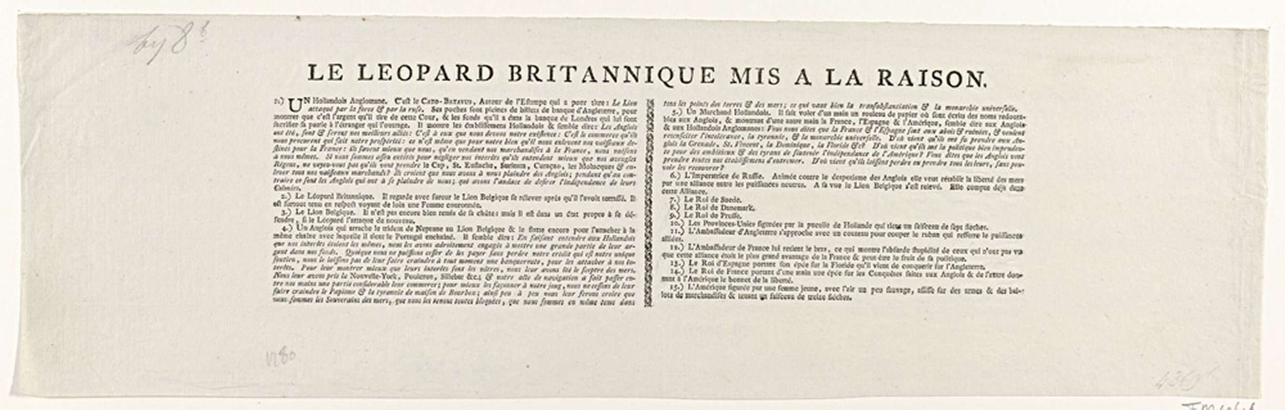 Tekstblad in het Frans bij de spotprent met de Britse luipaard en de Nederlandse leeuw, ca. 1780