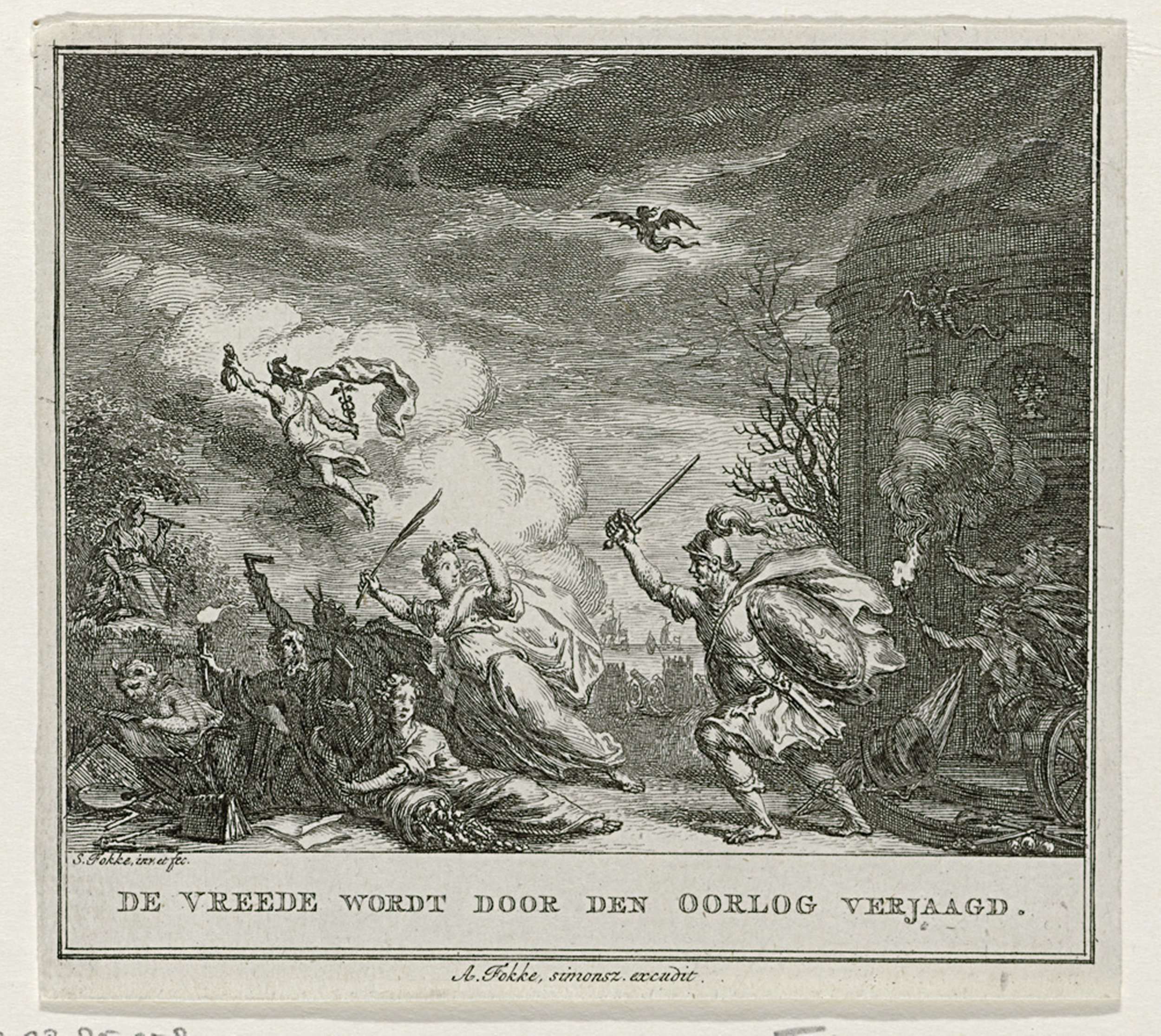 Allegorische voorstelling waarin de Oorlog de Vrede verjaagt. Rechts de tempel van Janus. Onderdeel van een groep illustraties met kleine allegorieën op de politieke situatie in het jaar 1780.