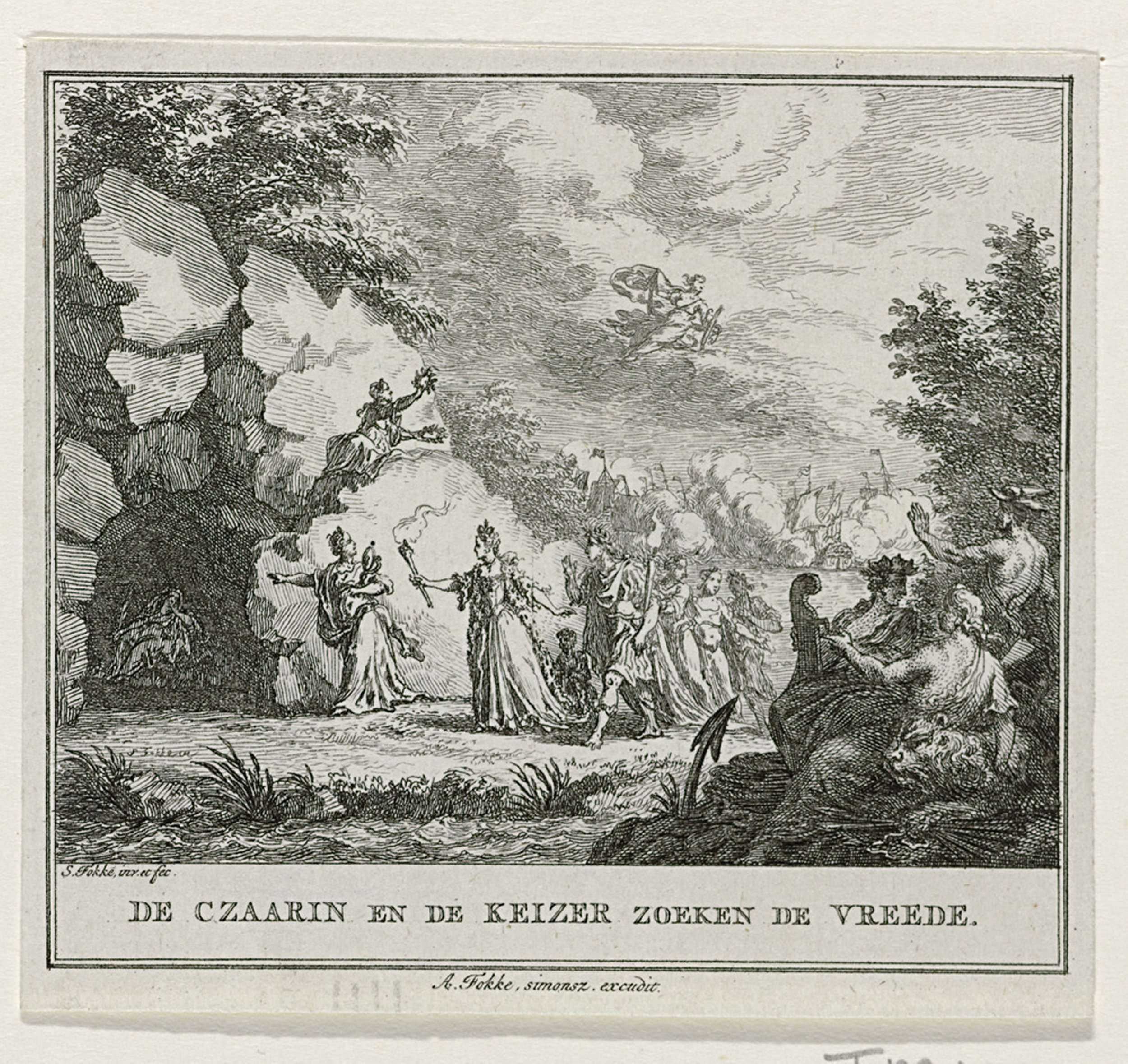 Allegorische voorstelling waarin tsarina Catharina de Grote en keizer Jozef II met toortsen op zoek gaan naar de Vrede die zich in een grot heeft verstopt. Onderdeel van een groep illustraties met kleine allegorieën op de politieke situatie in het jaar 1780.