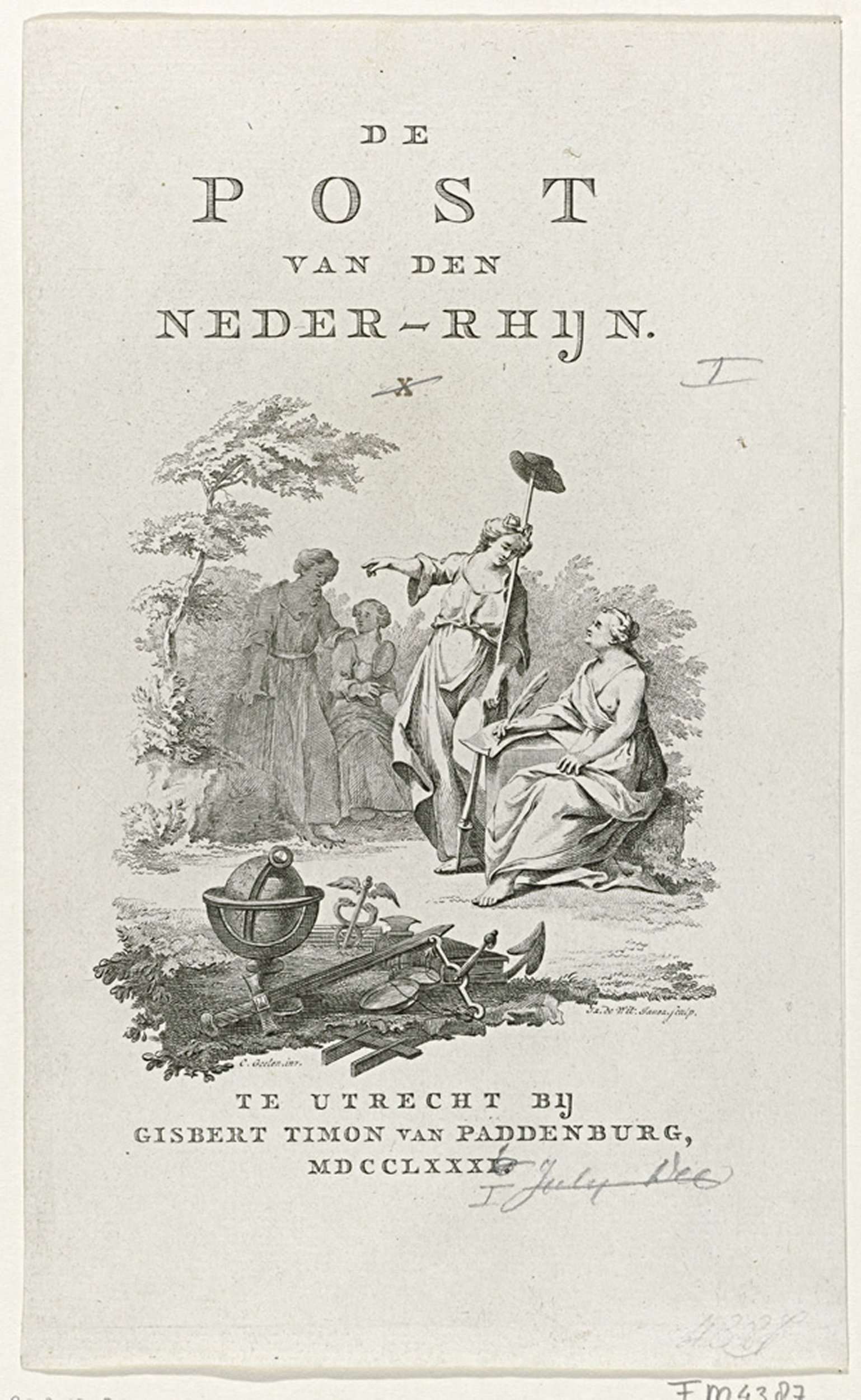 Titelpagina van het patriotische tijdschrift De Post van den Neder-Rhijn, dl. I, 1781. Allegorische voorstelling waarin Staatkunde, schrijvend bij een steen, door de Vrijheid gewezen wordt op de personificaties van Waarheid en Voorzichtigheid.