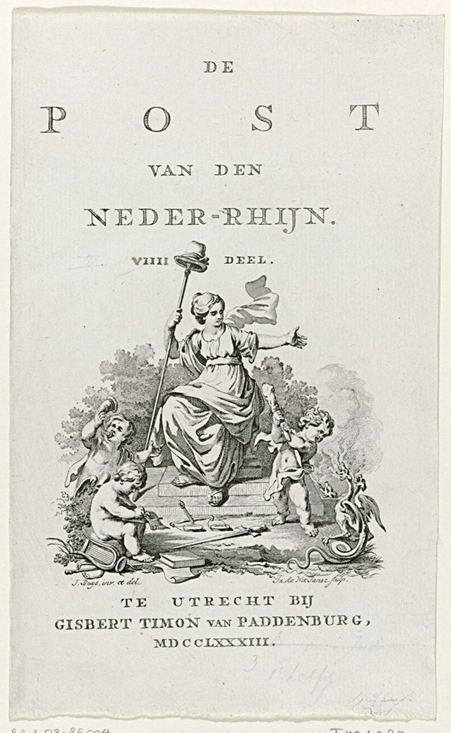 Titelpagina van het patriotische tijdschrift De Post van den Neder-Rhijn, dl. III, 1783. Allegorische voorstelling waarin de Vrijheid centraal op een verhoging zit, rechts verjaagt een kind een driekoppige slang.