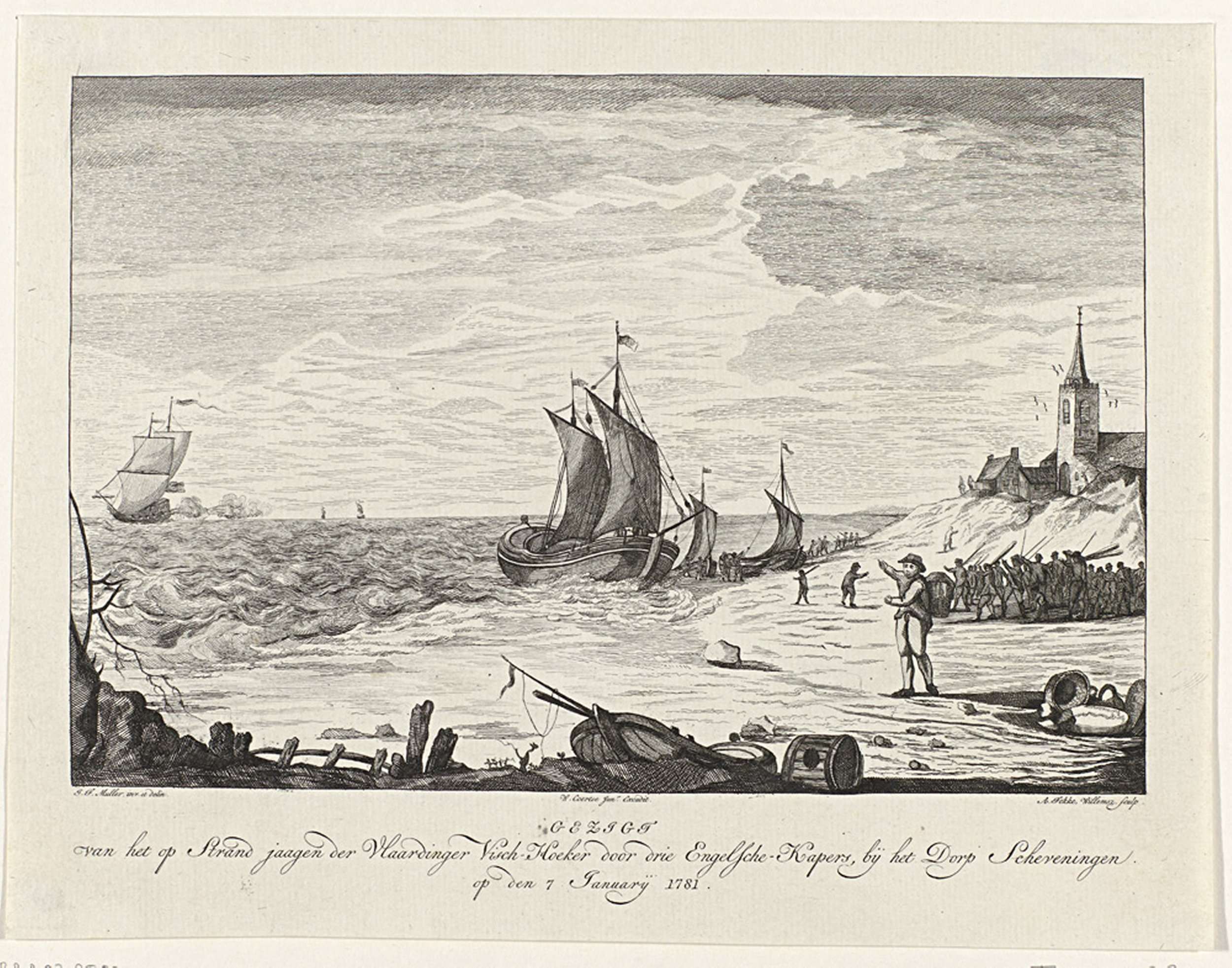 Een Vlaardinger hoeker tijdens het vissen door Engelse kapers het strand bij Scheveningen opgejaagd, 7 januari 1781. Het strand bij Scheveningen met een woedende menigte bij het vissersschip.