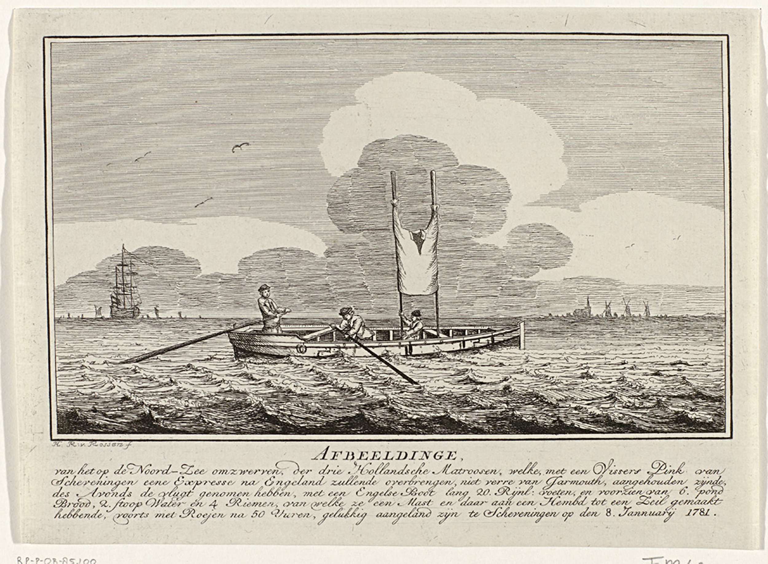 De aankomst van drie uit Engeland gevluchte Hollandse matrozen bij de kust bij Scheveningen op 8 januari 1781. De matrozen ontvluchtten aanhouding in Yarmouth en roeiden in een visserspink terug naar Nederland.