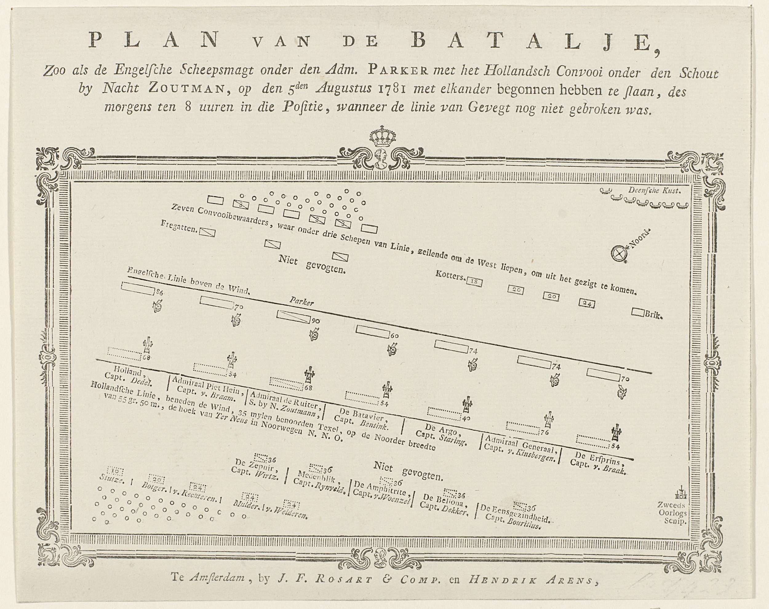 Slagorde van de Nederlandse en Engelse schepen tijdens de zeeslag bij Doggersbank op 5 augustus 1781 tussen de Nederlandse vloot onder schout-bij-nacht Johan Zoutman en de Engelse vloot onder vice-admiraal Hyde Parker. Binnen een decoratieve omlijsting van fileten.