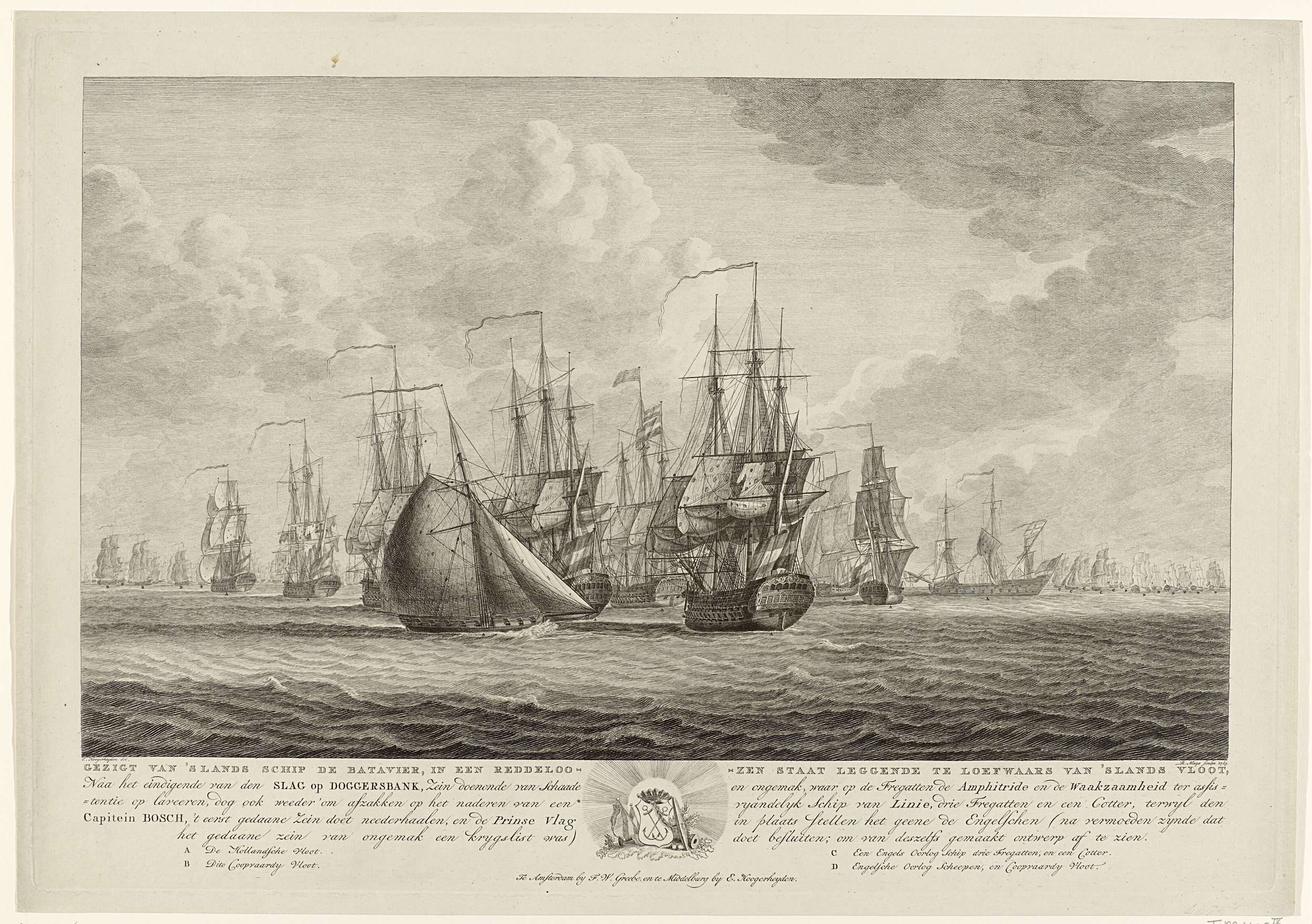 Het fregat de Batavier in reddeloze staat tijdens de zeeslag bij Doggersbank op 5 augustus 1781 tussen de Nederlandse vloot onder schout-bij-nacht Johan Zoutman en de Engelse vloot onder vice-admiraal Hyde Parker. Met vierregelig onderschrift en legenda A-D. Onderdeel van een serie van vier platen van de Zeeslag op de Doggersbank.