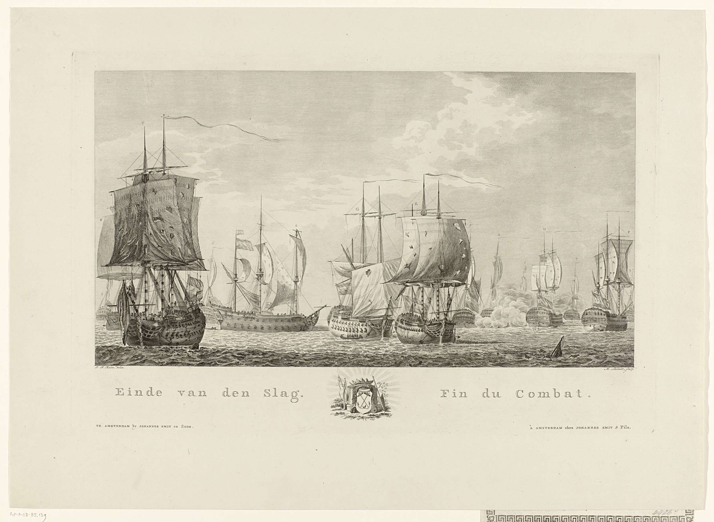 Het einde van de zeeslag bij Doggersbank op 5 augustus 1781 tussen de Nederlandse vloot onder schout-bij-nacht Johan Zoutman en de Engelse vloot onder vice-admiraal Hyde Parker. In de marge de titels in het Nederlands en Frans. Onderdeel van een serie van drie platen van de Zeeslag op de Doggersbank. Bij de prent behoort een ...