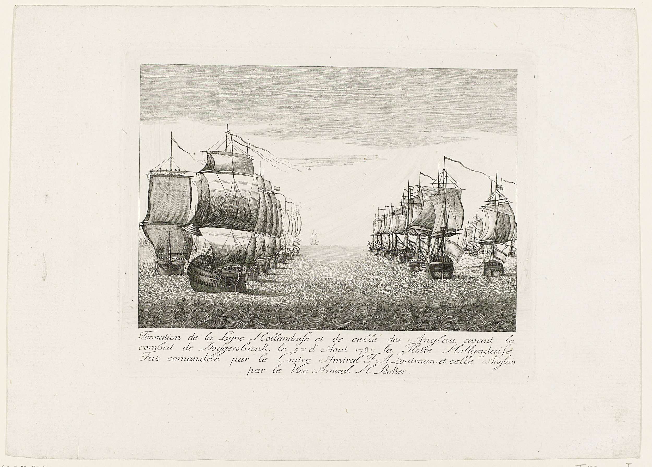 De Nederlandse en Engelse schepen in linie bij de aanvang van de zeeslag bij Doggersbank op 5 augustus 1781 tussen de Nederlandse vloot onder schout-bij-nacht Johan Zoutman en de Engelse vloot onder vice-admiraal Hyde Parker. In de marge de titel in het Frans. Onderdeel van een serie van vier platen van zeeslagen in het jaar ...