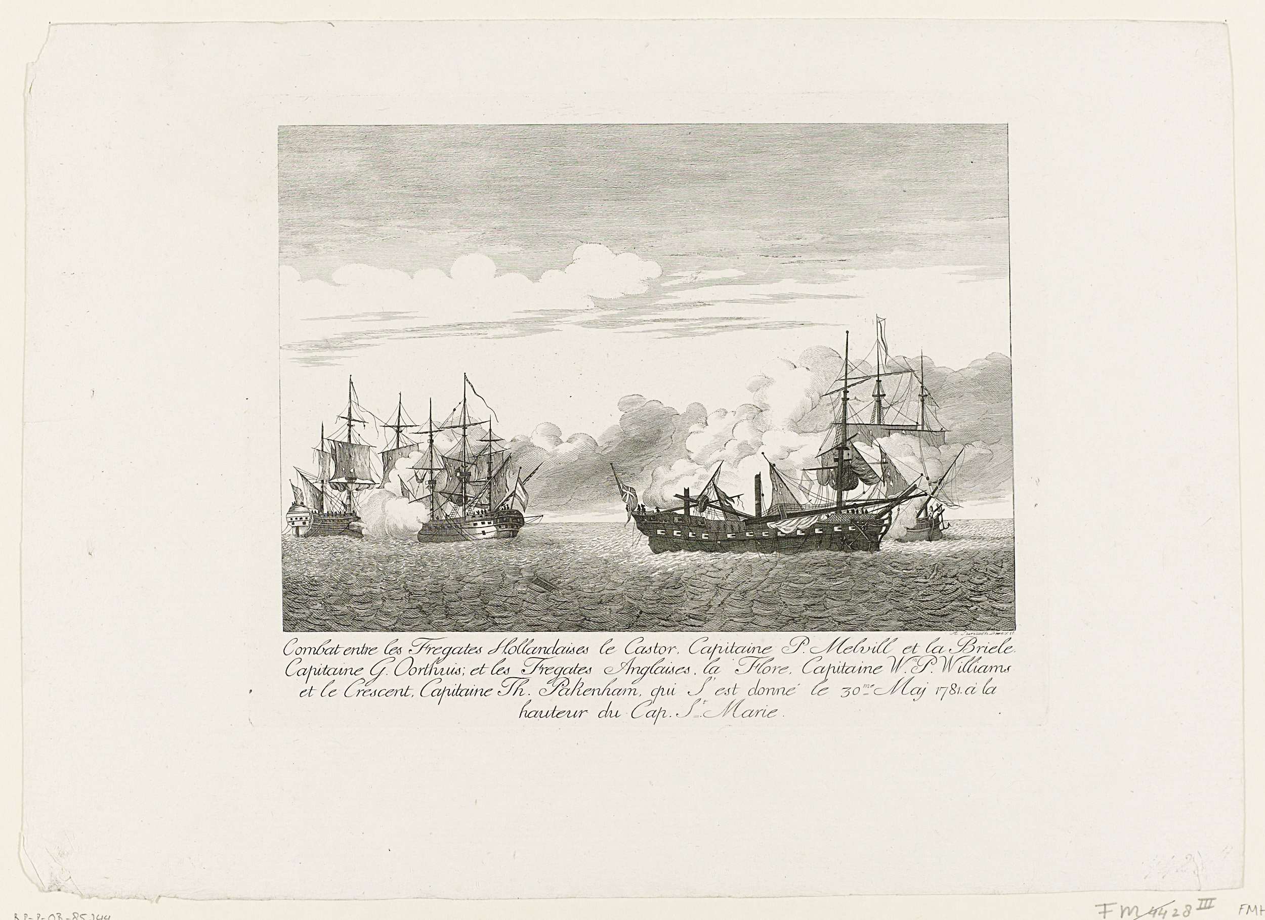Zeegevecht bij Cadiz tussen twee Nederlandse fregatten Castor en Den Briel en twee Engelse fregatten Flora en Crescent, 30 mei 1781. In de marge de titel in het Frans. Onderdeel van een serie van vier platen van zeeslagen in het jaar 1781.