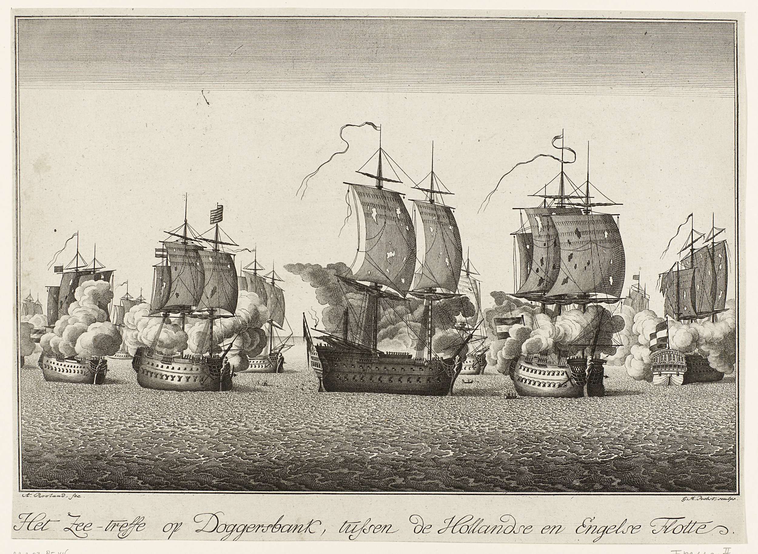 De Nederlandse en Engelse schepen tijdens de zeeslag bij Doggersbank op 5 augustus 1781 tussen de Nederlandse vloot onder schout-bij-nacht Johan Zoutman en de Engelse vloot onder vice-admiraal Hyde Parker. In de marge de titel in krom Nederlands. Onderdeel van een serie van vier Duitse platen van zeeslagen in het jaar 1781.