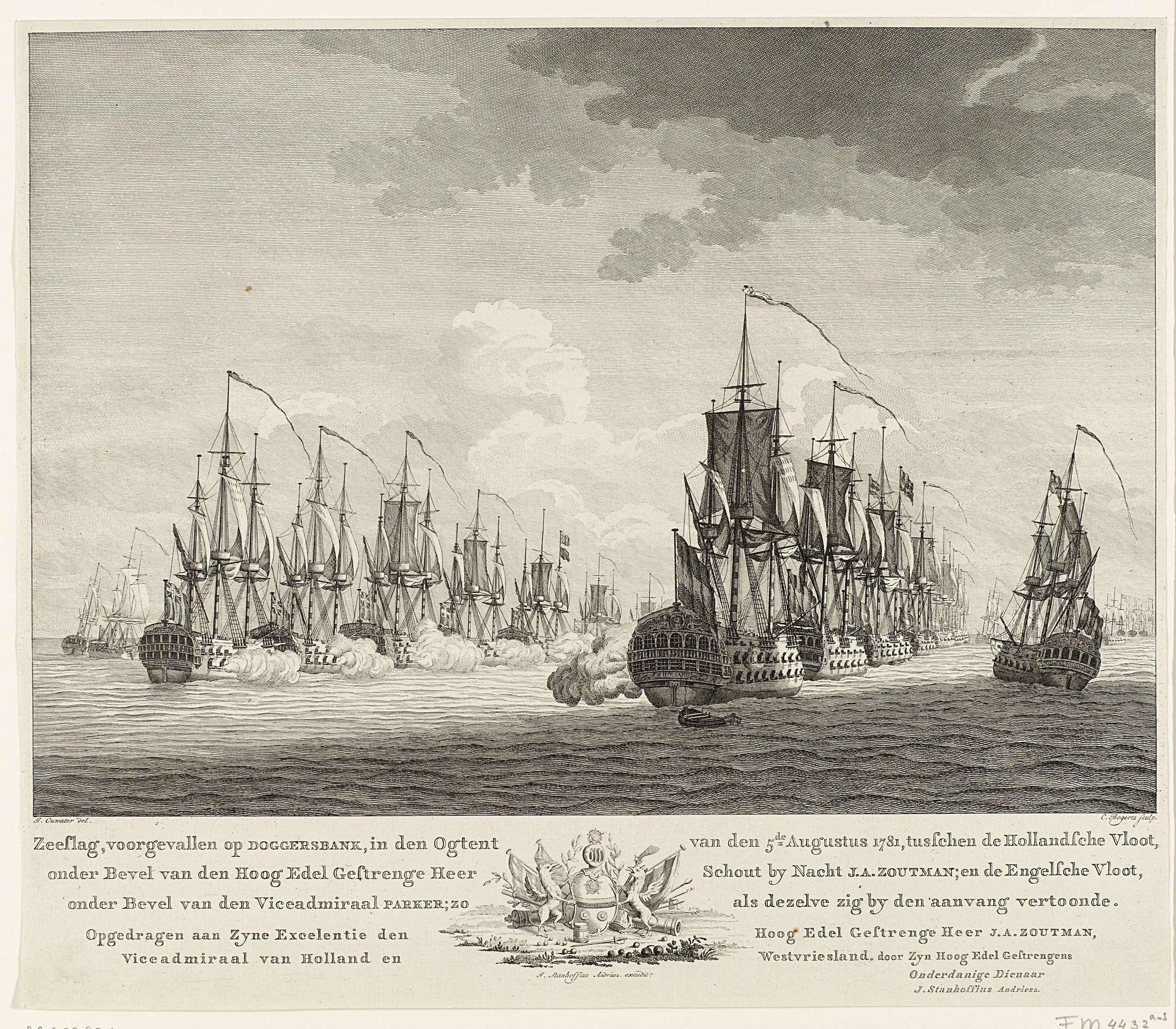 De Nederlandse en Engelse schepen in linie bij de aanvang van de zeeslag bij Doggersbank op 5 augustus 1781 tussen de Nederlandse vloot onder schout-bij-nacht Johan Zoutman en de Engelse vloot onder vice-admiraal Hyde Parker. In de marge de titel en opdracht in het Nederlands en in het midden het wapen van Zoutman. Onderdeel van ...