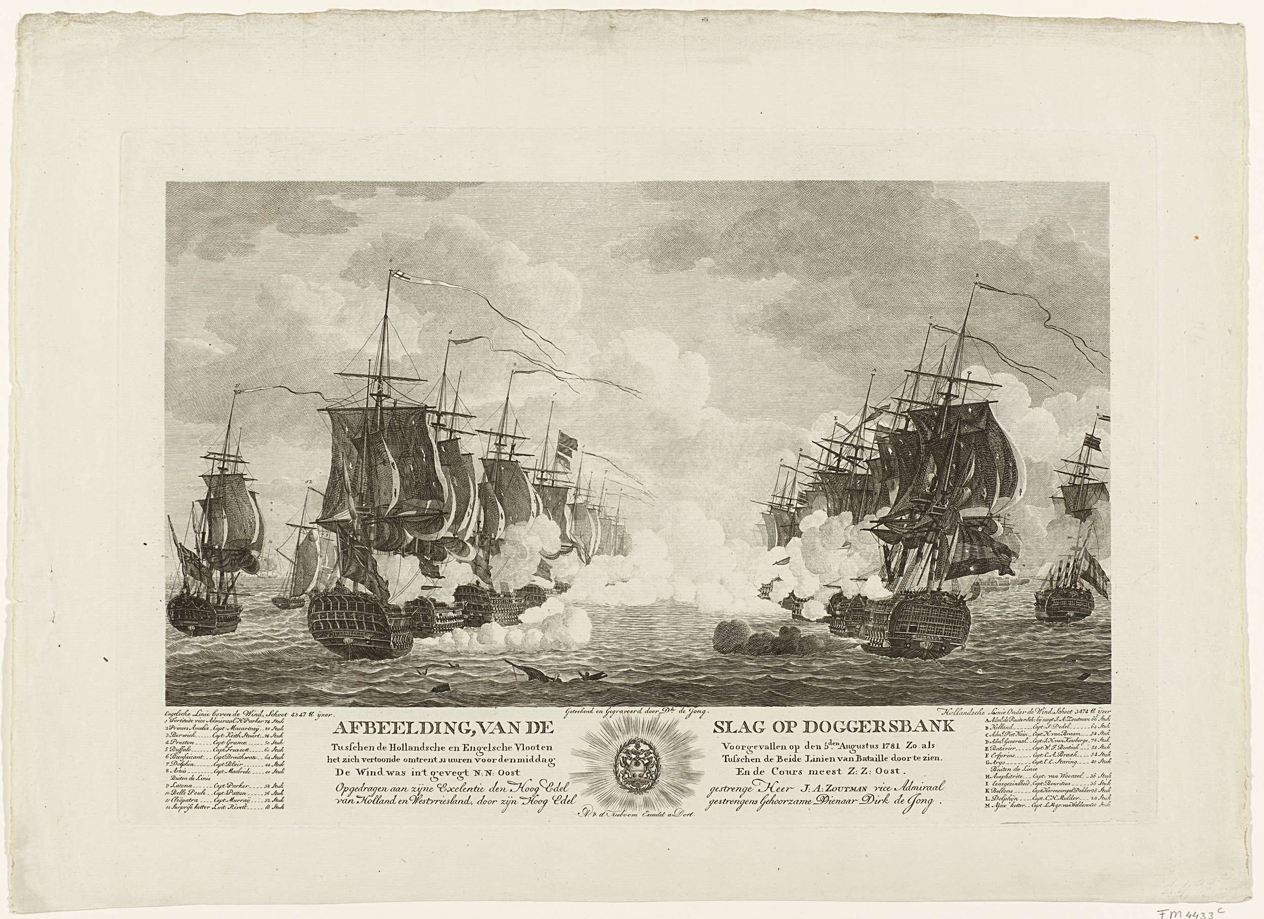 De Nederlandse en Engelse schepen in linie vuren op elkaar bij de aanvang van de zeeslag bij Doggersbank op 5 augustus 1781 tussen de Nederlandse vloot onder schout-bij-nacht Johan Zoutman en de Engelse vloot onder vice-admiraal Hyde Parker. In de marge onderaan de titel, de opdracht en de legenda van de schepen met namen van ...