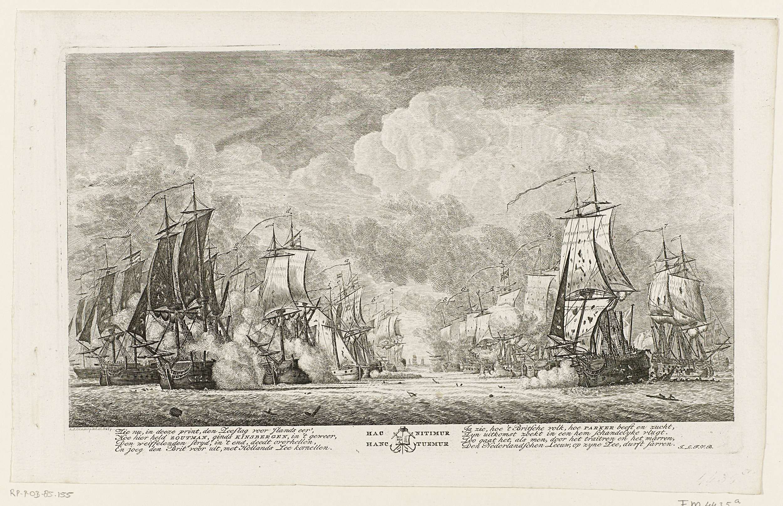 De Nederlandse en Engelse schepen tijdens de zeeslag bij Doggersbank op 5 augustus 1781 tussen de Nederlandse vloot onder schout-bij-nacht Johan Zoutman en de Engelse vloot onder vice-admiraal Hyde Parker. In de marge onderaan een achtregelig vers in twee kolommen met in het midden een vignet met twee gekruiste ankers, bijbel en een Latijnse spreuk.