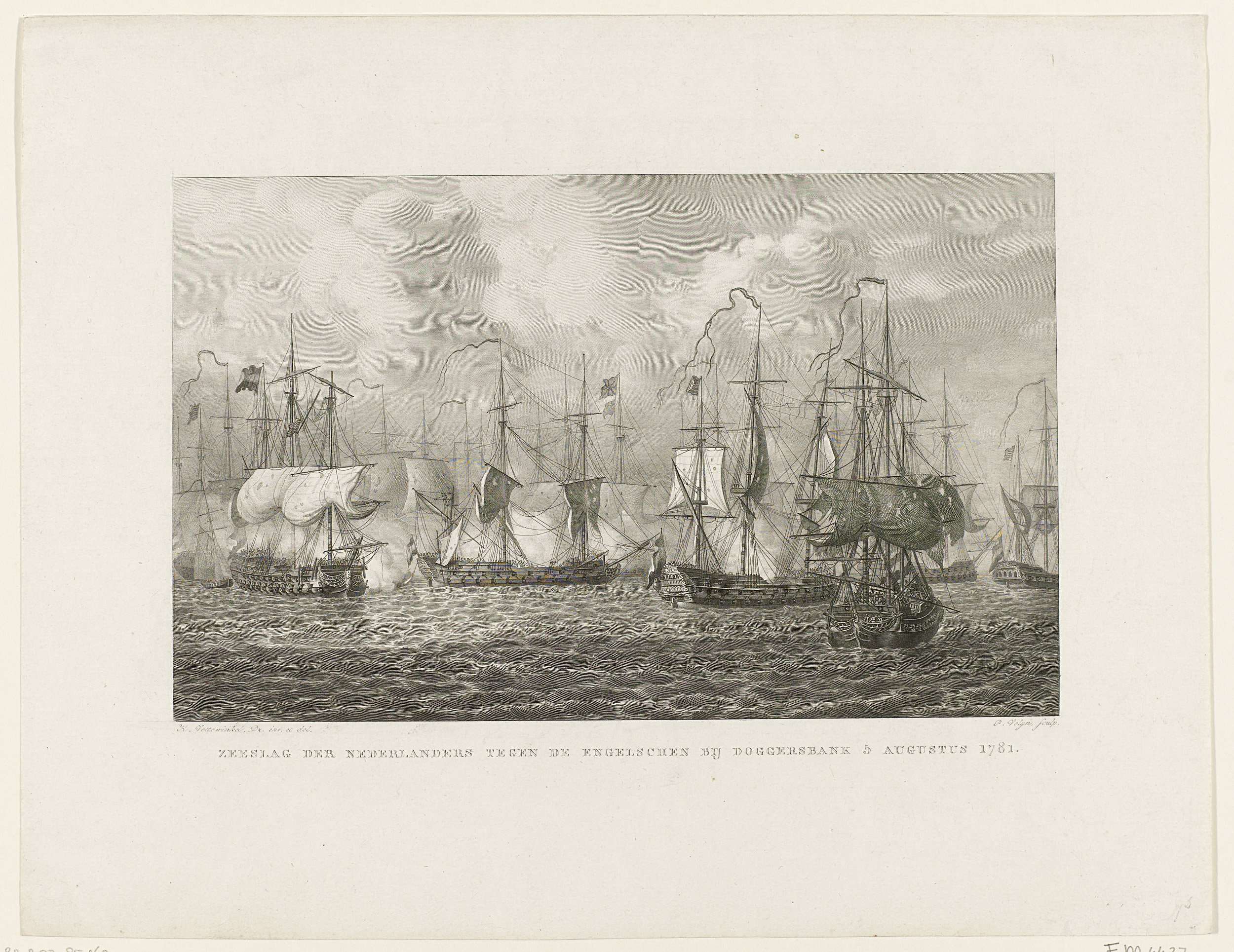 De Zeeslag bij Doggersbank op 5 augustus 1781 tussen de Nederlandse vloot onder schout-bij-nacht Johan Zoutman en de Engelse vloot onder vice-admiraal Hyde Parker. Bij de prent behoort een los tekstblad met een verklaring van de plaat.