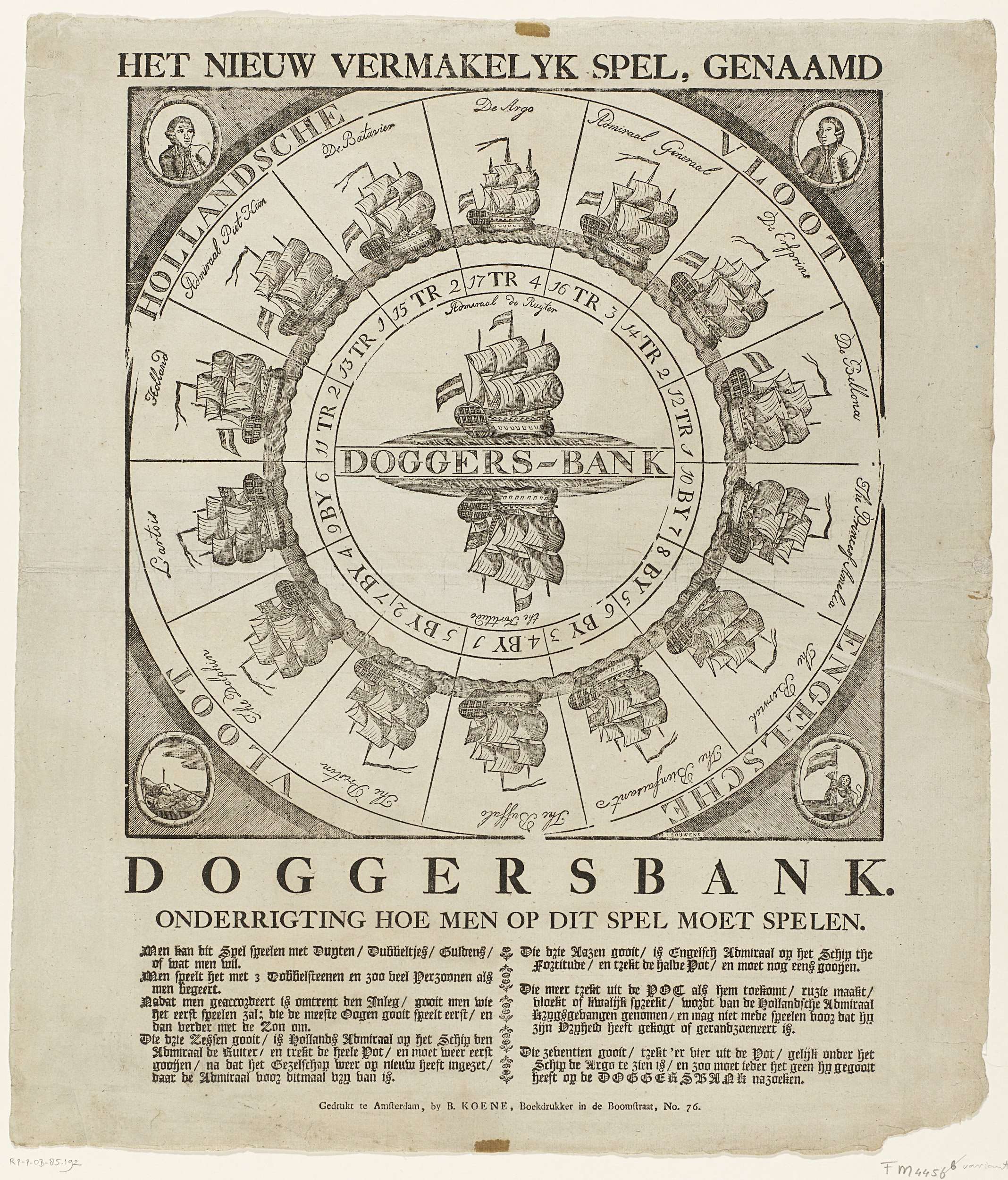 Bordspel naar aanleiding van de overwinning in de zeeslag bij Doggersbank tussen de Nederlandse en de Britse vloot op 5 augustus 1781. De posities op het bord en in het midden zijn de Nederlandse en Britse schepen die betrokken waren bij de slag. Op het blad onder de voorstelling de spelregels.