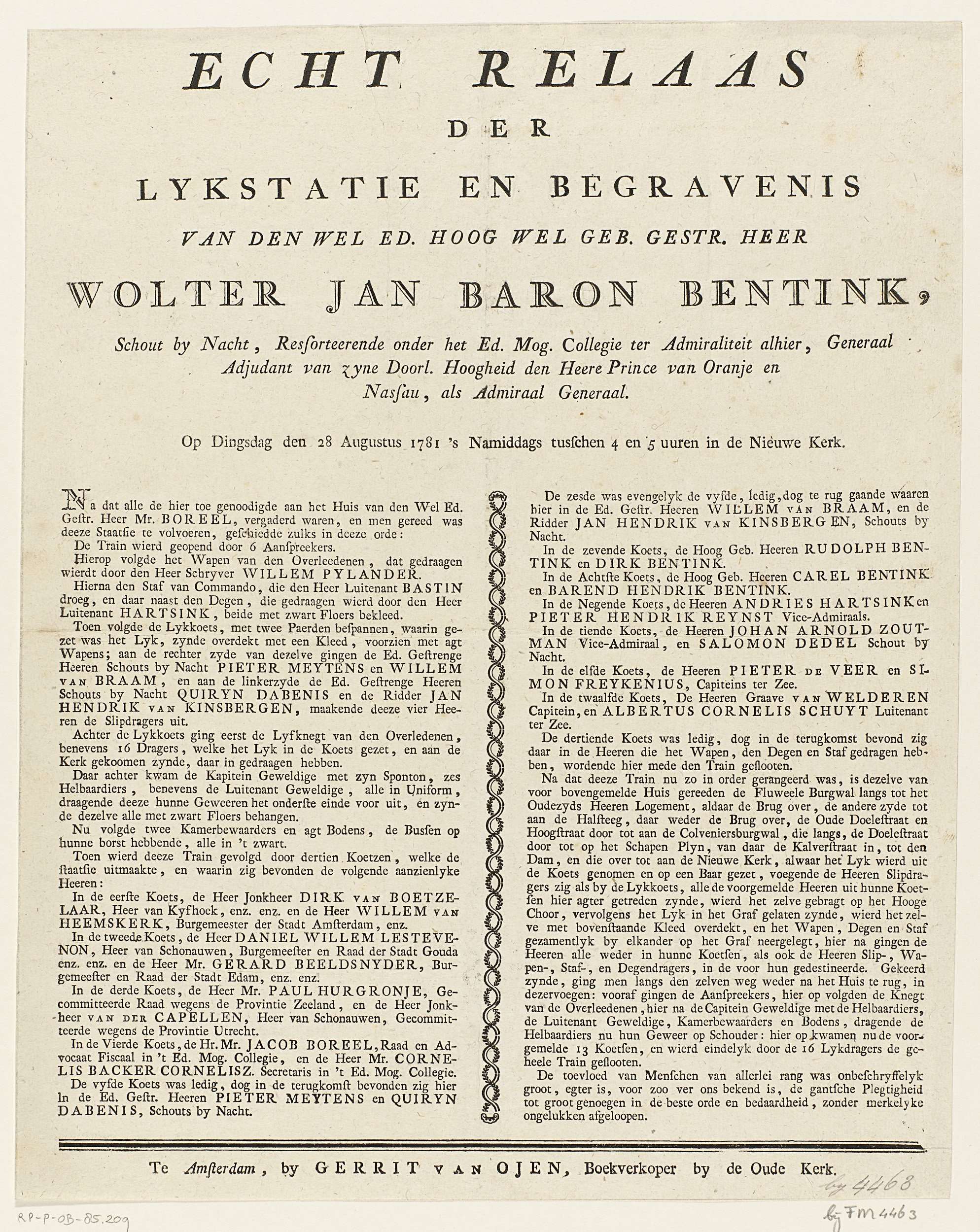 Beschrijving van de lijkstatie en begrafenis van Wolter Jan Gerrit baron Bentinck, 1781