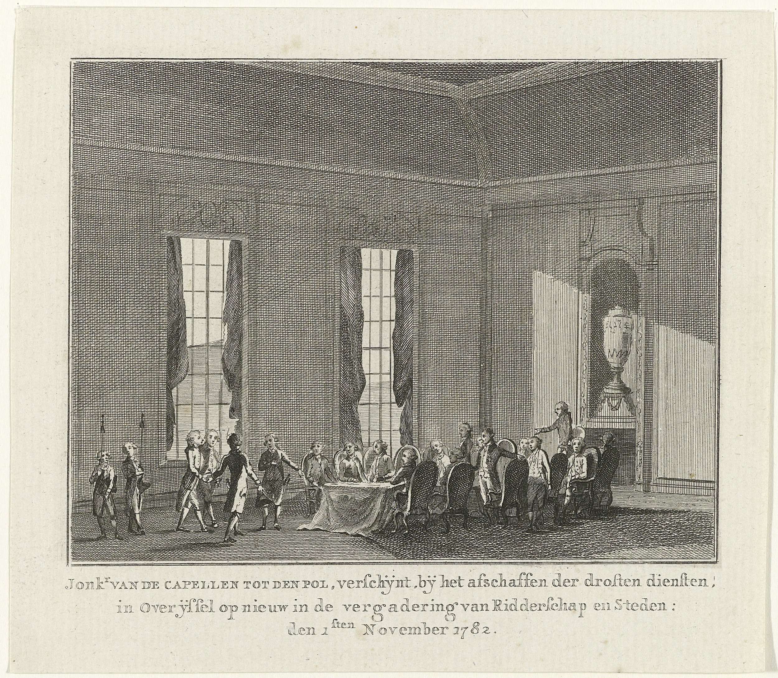Joan Derk Baron van der Capellen tot den Poll verschijnt opnieuw in de vergadering van Ridderschap en Steden te Overijssel, 1 november 1782. Fragment van een grotere plaat met de titel 'Atlas der Geschiedenissen van onzen tyd. Plaat I'. Dit was een proefaflevering van een nieuwe reeks voorstellingen van historische gebeurtenissen uit de jaren 1780-1787, ...