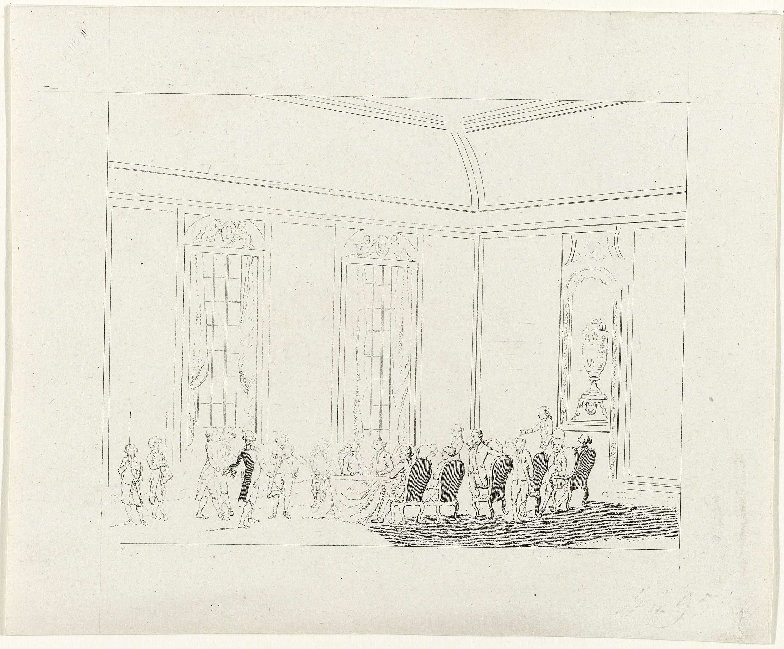 Joan Derk Baron van der Capellen tot den Poll verschijnt opnieuw in de vergadering van Ridderschap en Steden te Overijssel, 1 november 1782. Fragment van een grotere plaat met de titel 'Atlas der Geschiedenissen van onzen tyd. Plaat I'. Dit was een proefaflevering van een nieuwe reeks voorstellingen van historische gebeurtenissen uit de jaren 1780-1787, ...