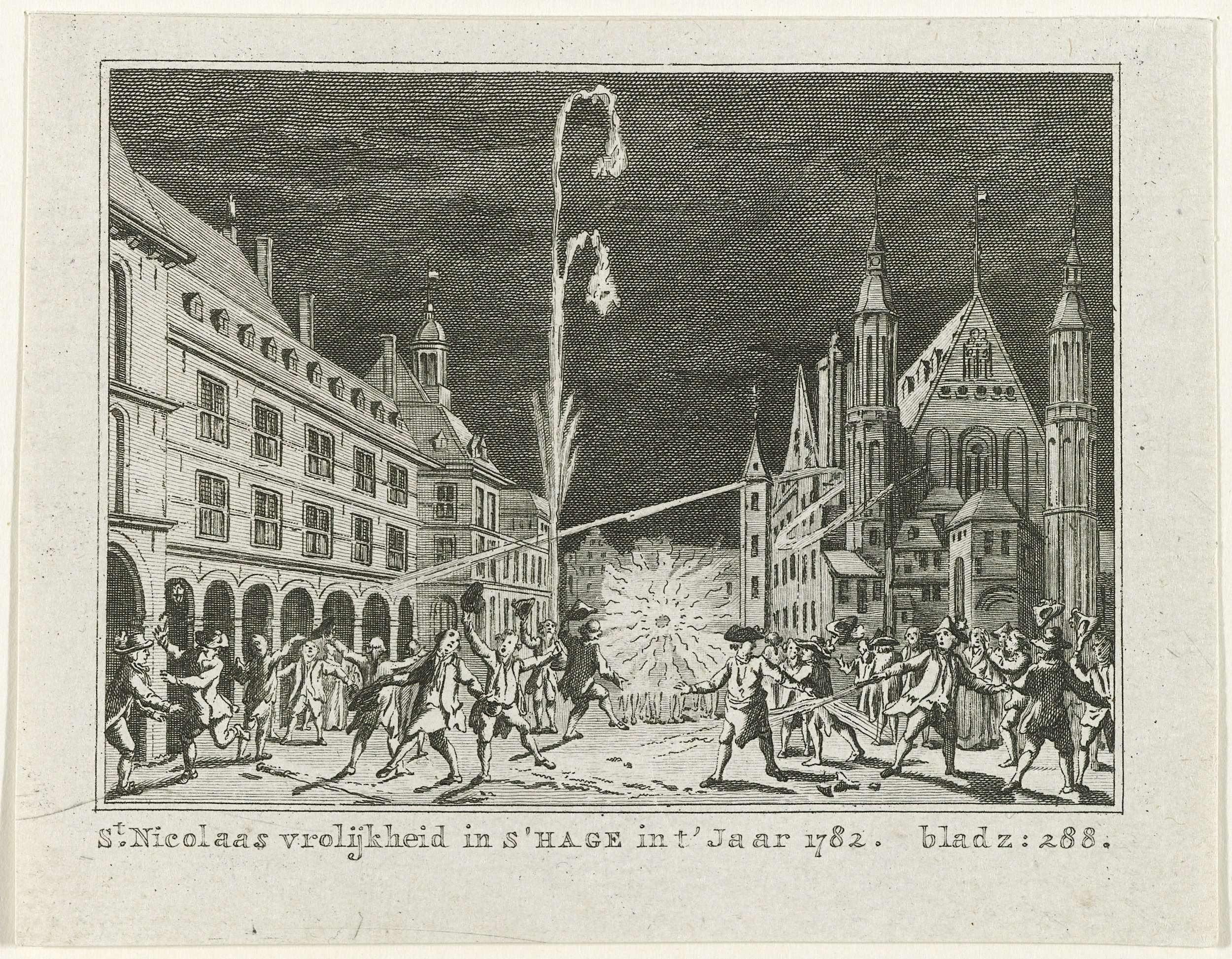Het Nicolaasoproer, of 'Haagse vrolijkheid' door Orangisten op het Binnenhof te Den Haag op 6 december 1782. Dansen en vuurwerk op straat. In het onderschrift de verwijzing naar blz. 288.