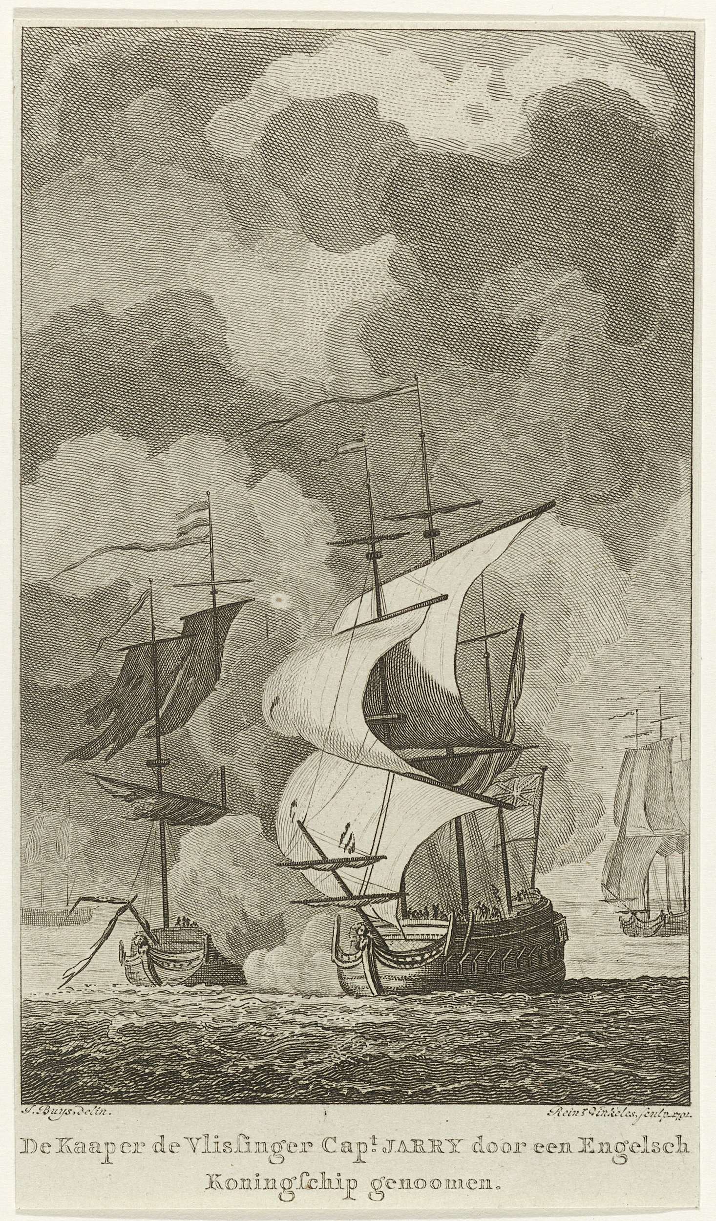 Het kaperschip 'de Vlissinger' van kaperkapitein Nicolas Jarry in gevecht met een Engels oorlogsschip, bij het gevecht sneuvelt Jarry, januari 1783.