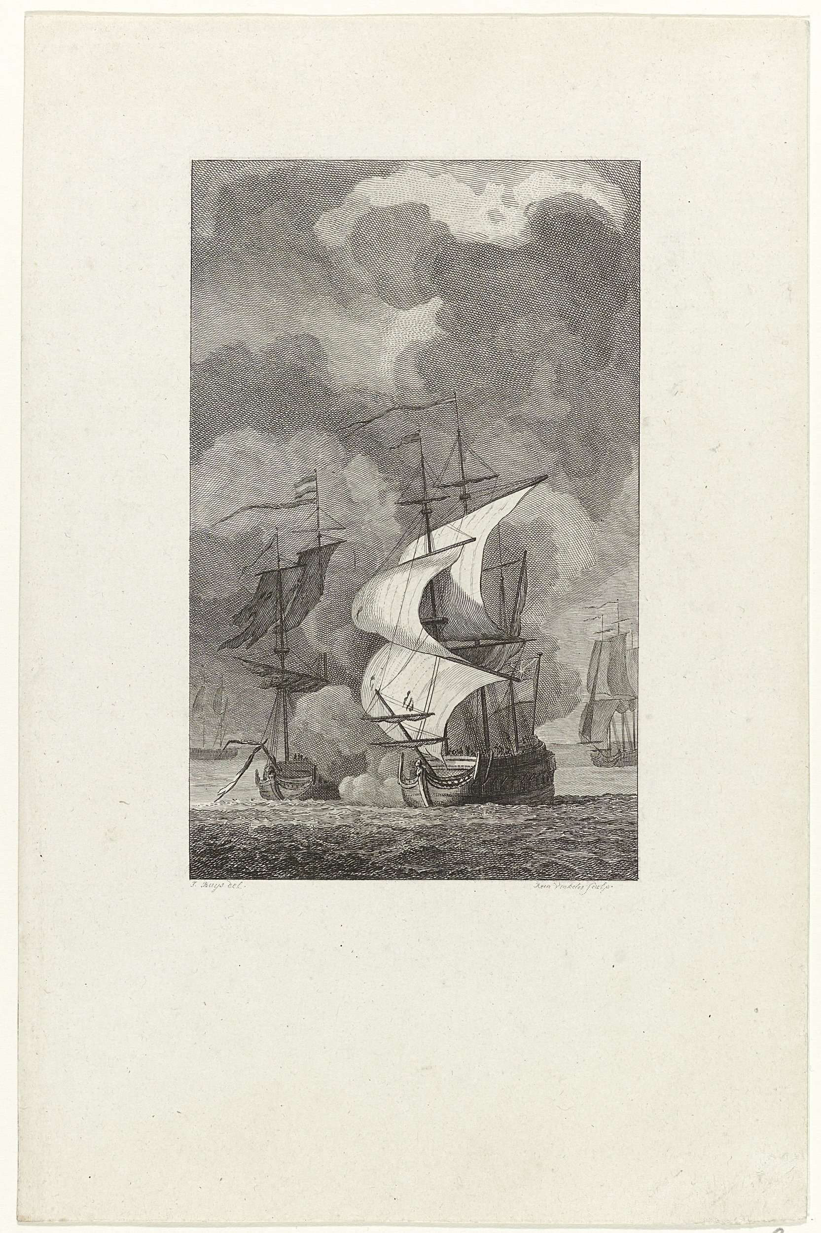 Het kaperschip 'de Vlissinger' van kaperkapitein Nicolas Jarry in gevecht met een Engels oorlogsschip, bij het gevecht sneuvelt Jarry, januari 1783.