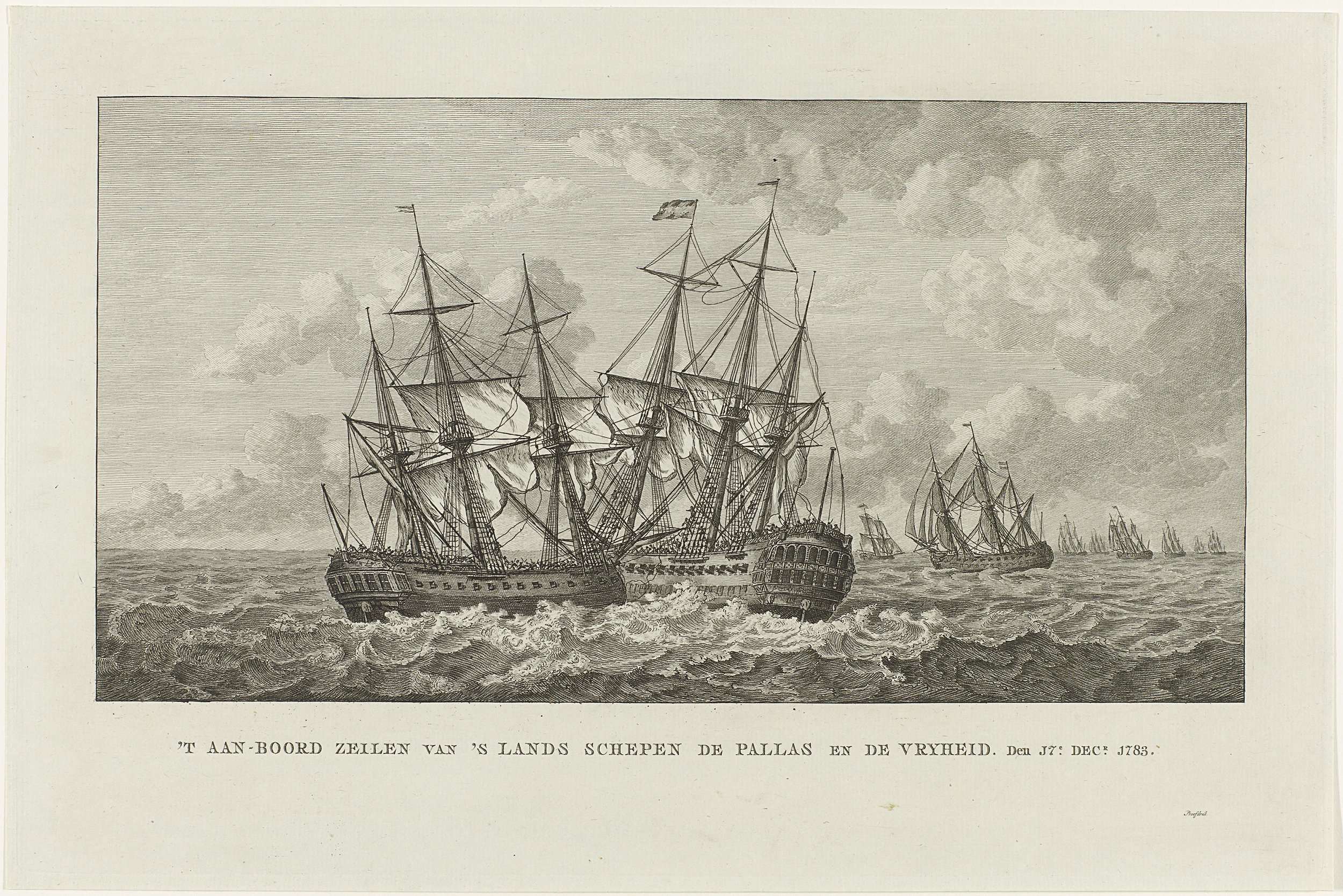 Aanvaring op zee tussen de schepen de Pallas en de Vrijheid, 17 december 1783. Gemerkt rechtsonder: Proefdruk. Onderdeel van de serie van historische gebeurtenissen op zee in de jaren 1782-1784, eerste serie.
