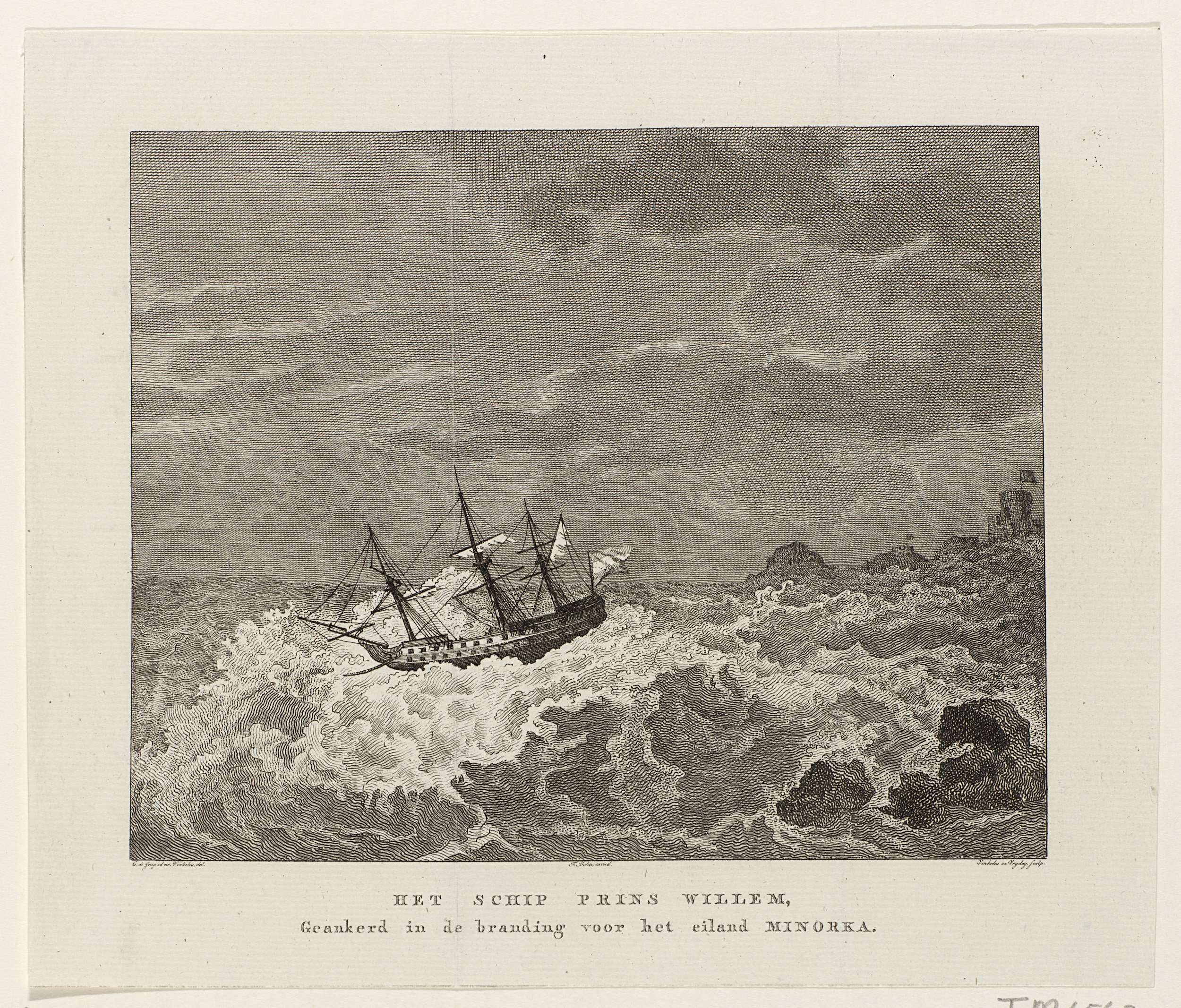 Het oorlogsschip Prins Willem, onder bevel van kapitein C. van Gennep, geankered voor de kust van Menorca tijdens de storm op 3 februari 1784.