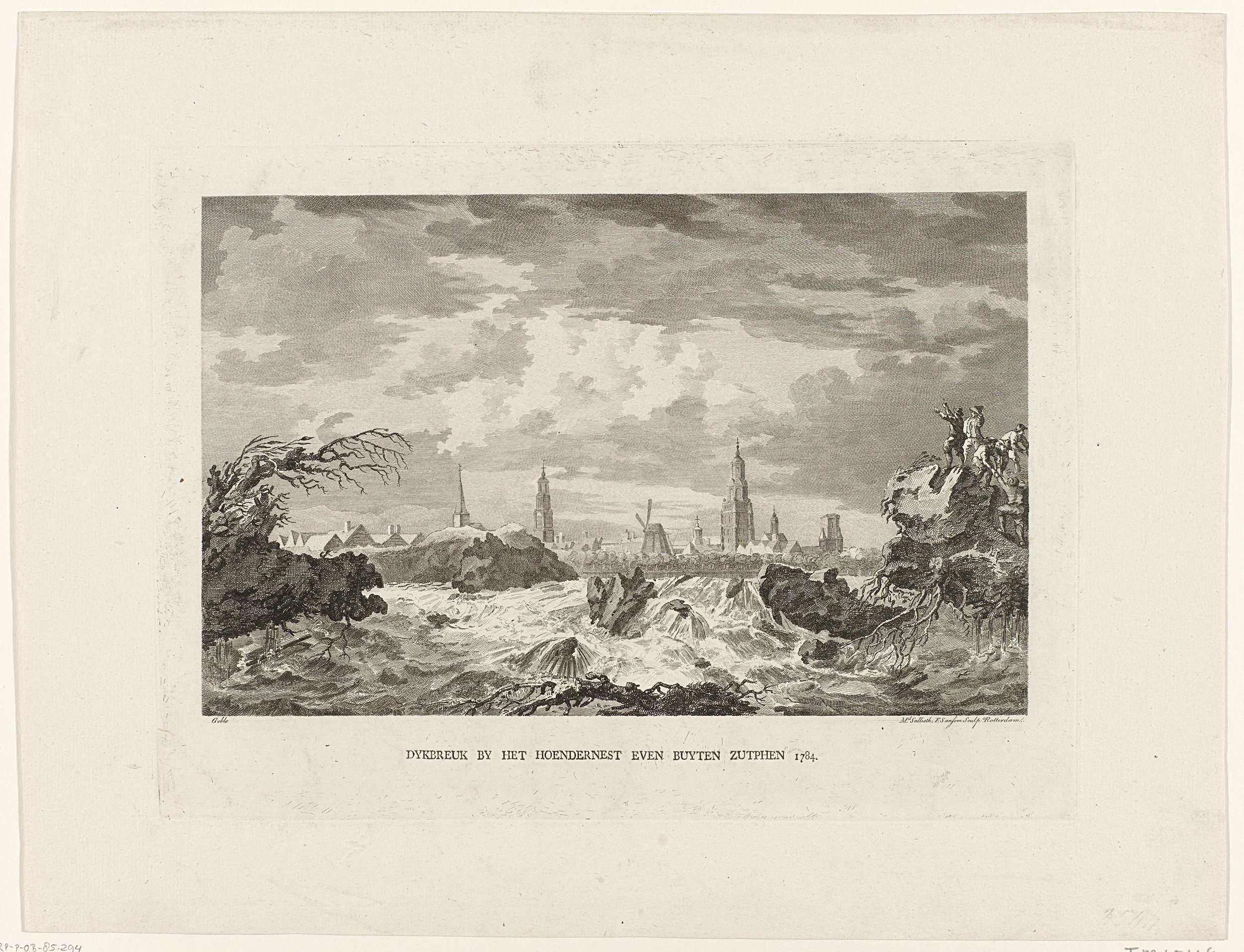 Dijkdoorbraak bij het zgn. Hoendernest, buiten Zutphen, 3 maart 1784. Op de voorgrond mensen in paniek bij de doorgebroken dijk, op de achtergrond de stad Zutphen.