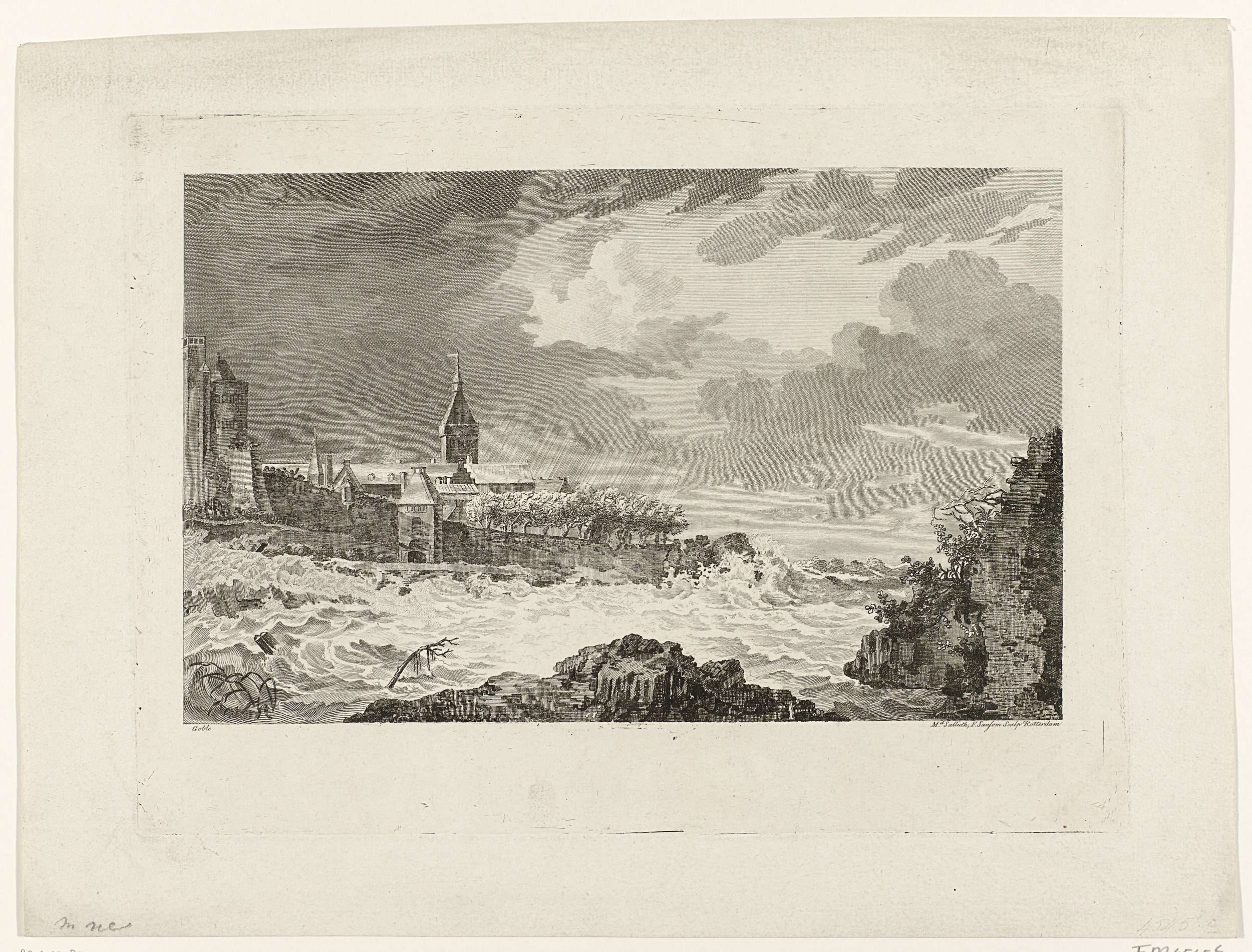 Het instorten van de Lappentoren aan de stadswallen van Nijmegen tijdens hoogwater in de Waal op 4 maart 1784.