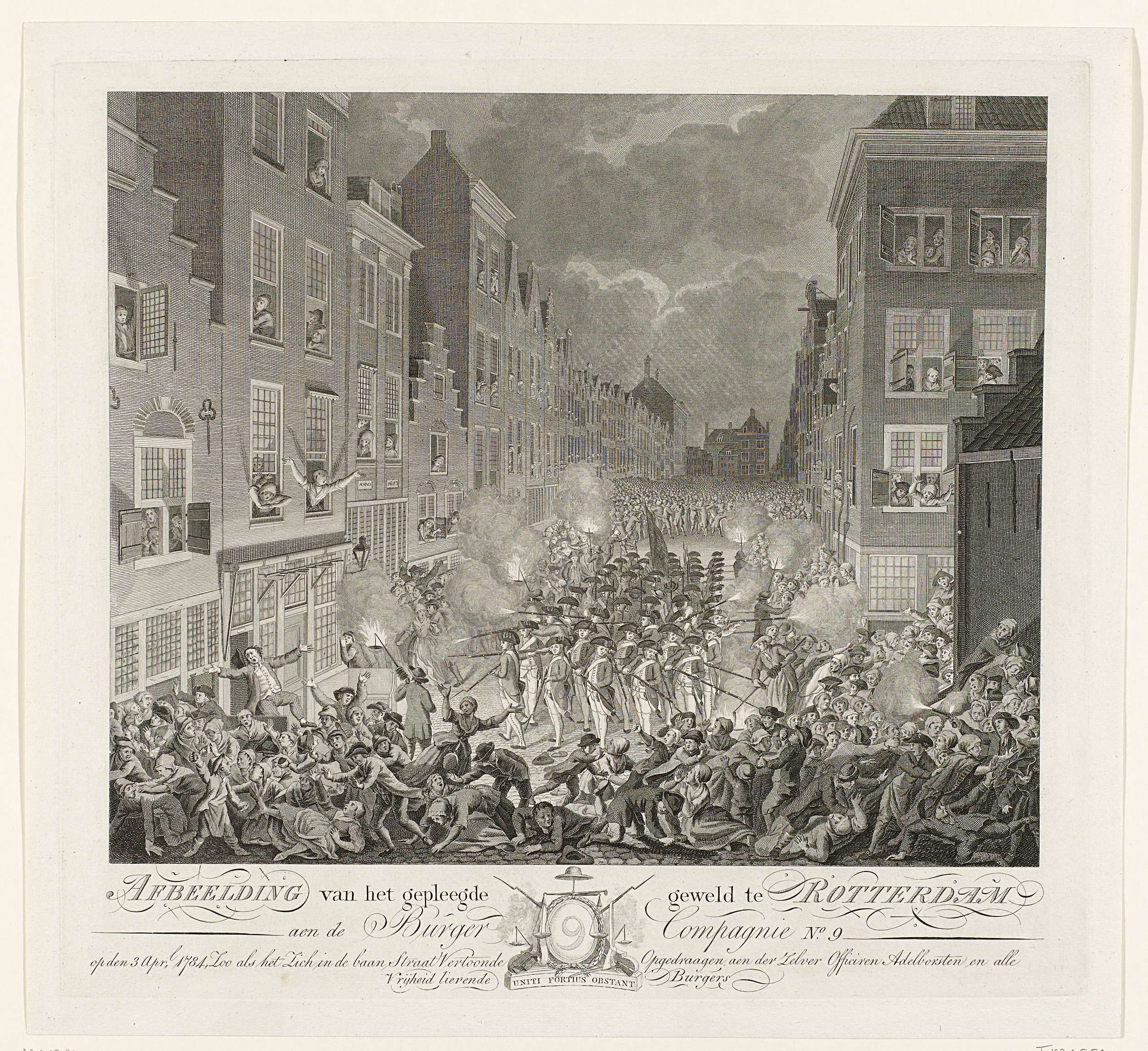 Treffen tussen de Negende Burgercompagnie en Orangisten in de Prinsenstraat te Rotterdam, in de avond van 3 op 4 april 1784. De compagnie onder luitenant-kolonel Elsevier opent het vuur op de mensenmenigte. In het onderschrift het embleem van Burgercompagnie No. 9 en een opdracht aan "der Zelver Officieren Adelborsten en alle Vrijheid lievende Burgers".