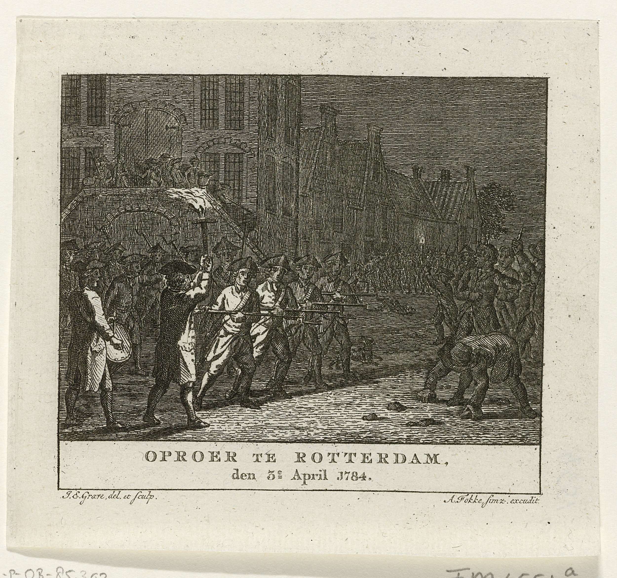 Geweldadig treffen tussen de Negende Burgercompagnie en orangisten voor het stadhuis te Rotterdam, in de avond van 3 april 1784.